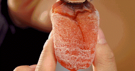 再之后的重要步骤,便是富平柿饼标志性的挂霜。这一步,离不开“潮霜”时的时机把握。吊晒在外的柿饼,在长达48天的风霜浸染、日晒月映中,水分缓慢蒸发,果肉中的葡萄糖和果糖等物质渗透出来,形成结晶白霜,这即是富平柿饼的又一精华所在。