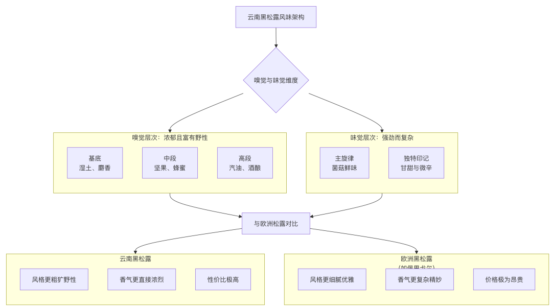 为了更好的与欧洲黑松露的对比,美食编辑做了个图表,可快速了解我们云南黑松露的核心风味构成。