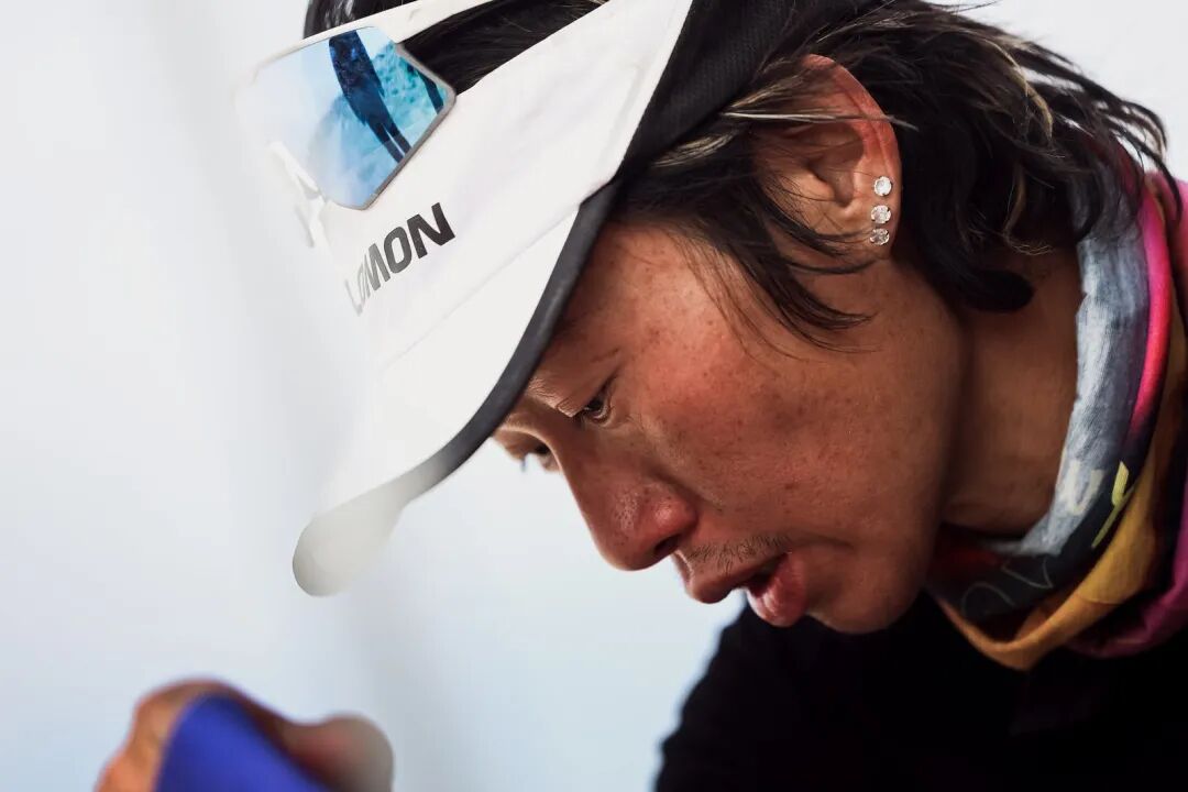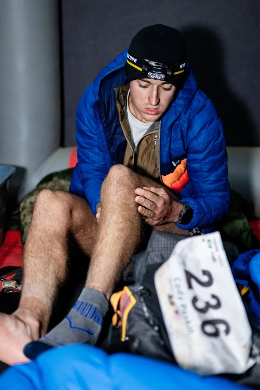 当选手们钻进夜晚的补给站时,摘下面罩,每个人的脸上已经结了一层薄薄盐壳,泛着晶莹的光;帐篷里有人把头埋在双臂里睡着,有人靠着帐篷的骨架就地按摩僵硬的小腿。夜色和灯光把这些瞬间拉成长长的光影片段,帐篷里,医生们正有条不紊地忙碌,检查选手们的心率、状态,帮选手们按摩,舒缓筋膜,放松肌肉。很多选手按摩还没结束,就进入了梦乡。