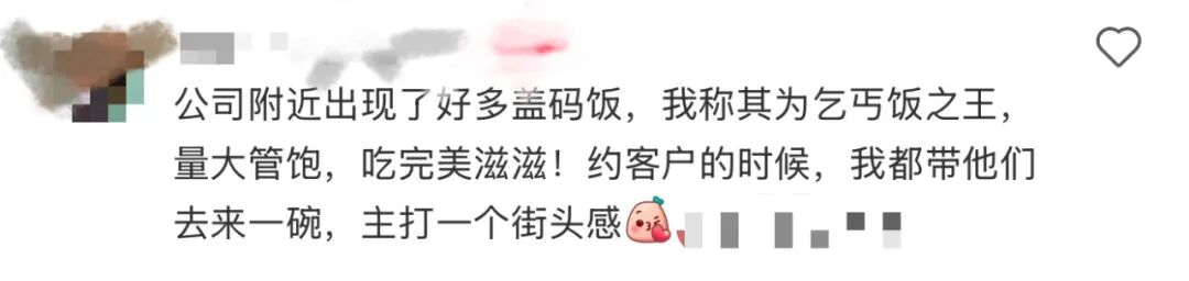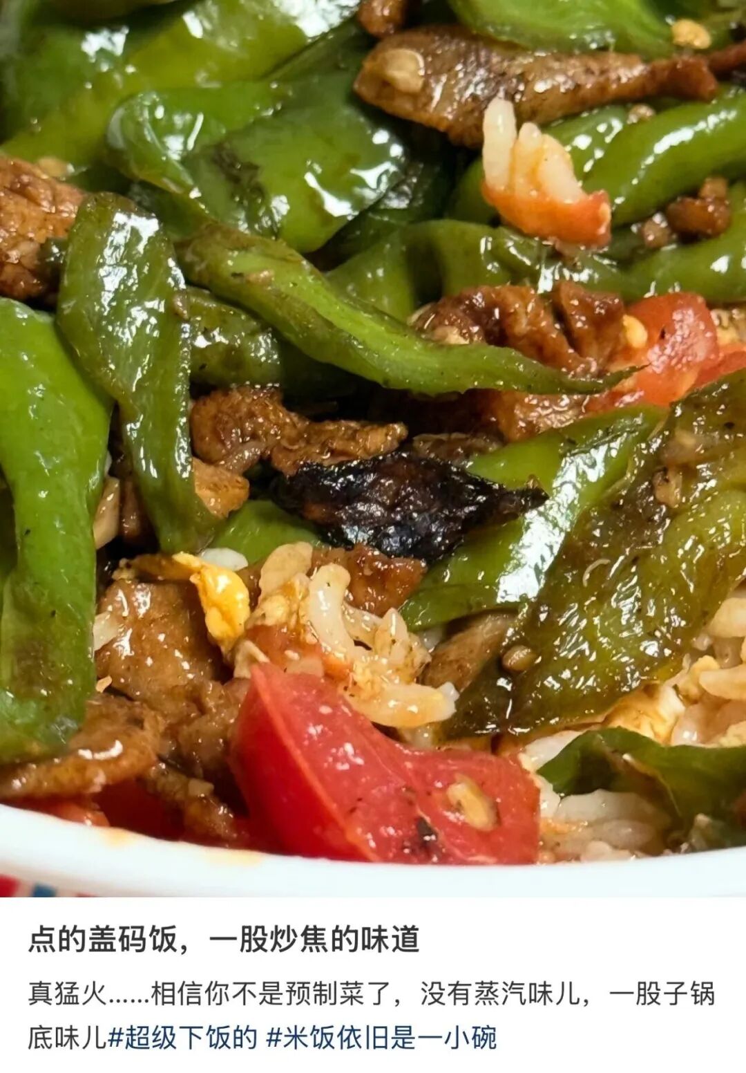 而且作为穷饱饭,大家对盖码饭的宽容度也很高,“都这个价了,就算是预制菜我也认了,结果一口下去竟吃出了锅底灰,有一种中头奖的感觉,那种久违的感动,让你想起地锅风味。”
