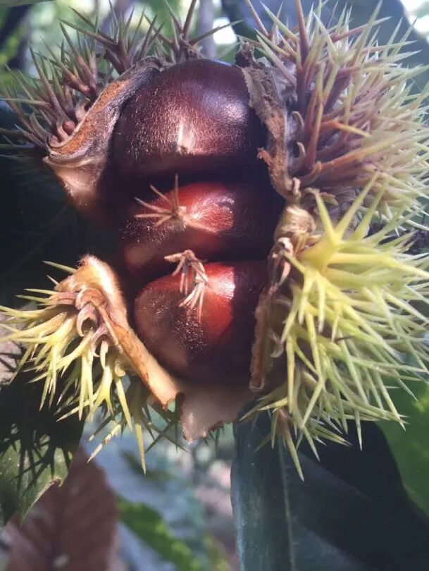 别看栗子在人前一派光滑敦厚模样,其实本体是个张牙舞爪的大刺头。还在树上的栗子三个一组,挤挤挨挨地藏在一棵浑身带刺的栗蓬里。等到十月里,栗蓬逐渐由绿变黄,中间撑开白色的十字线,褐色板栗这次露出真容。即使是同一棵树上的栗子也不会一起成熟落地,于是捡栗子几乎可以贯穿整个秋天。