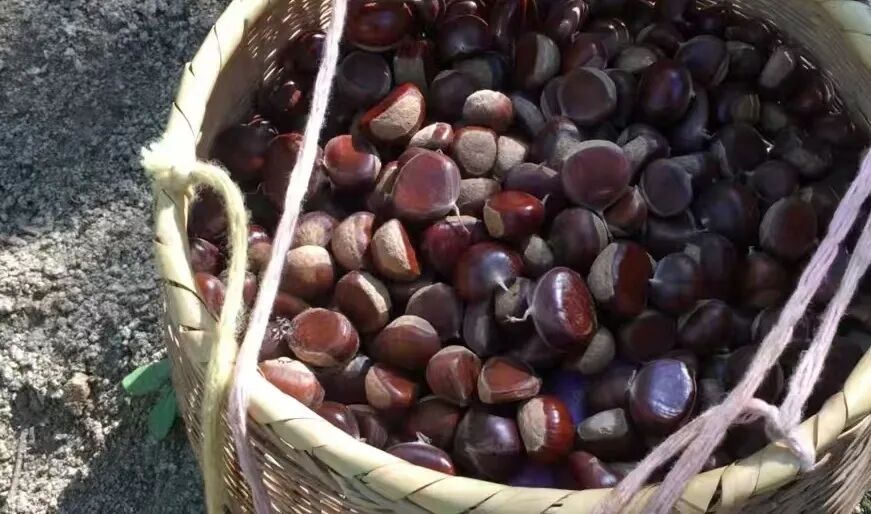 当然,这样的耗时耗力是采用传统采收方式的情况下。现在的栗子为了统一、规范、便利,大部分用的都是“打板栗”的采收方式,即选一个好日子统一敲打下所有的栗子,一次性采收。采回去之后,再用堆放、喷水等方式催熟板栗,最后机器脱掉板栗的栗蓬。这样的板栗,保存起来容易腐坏生虫,口感跟自然成熟脱落的板栗亦不可同日而语。