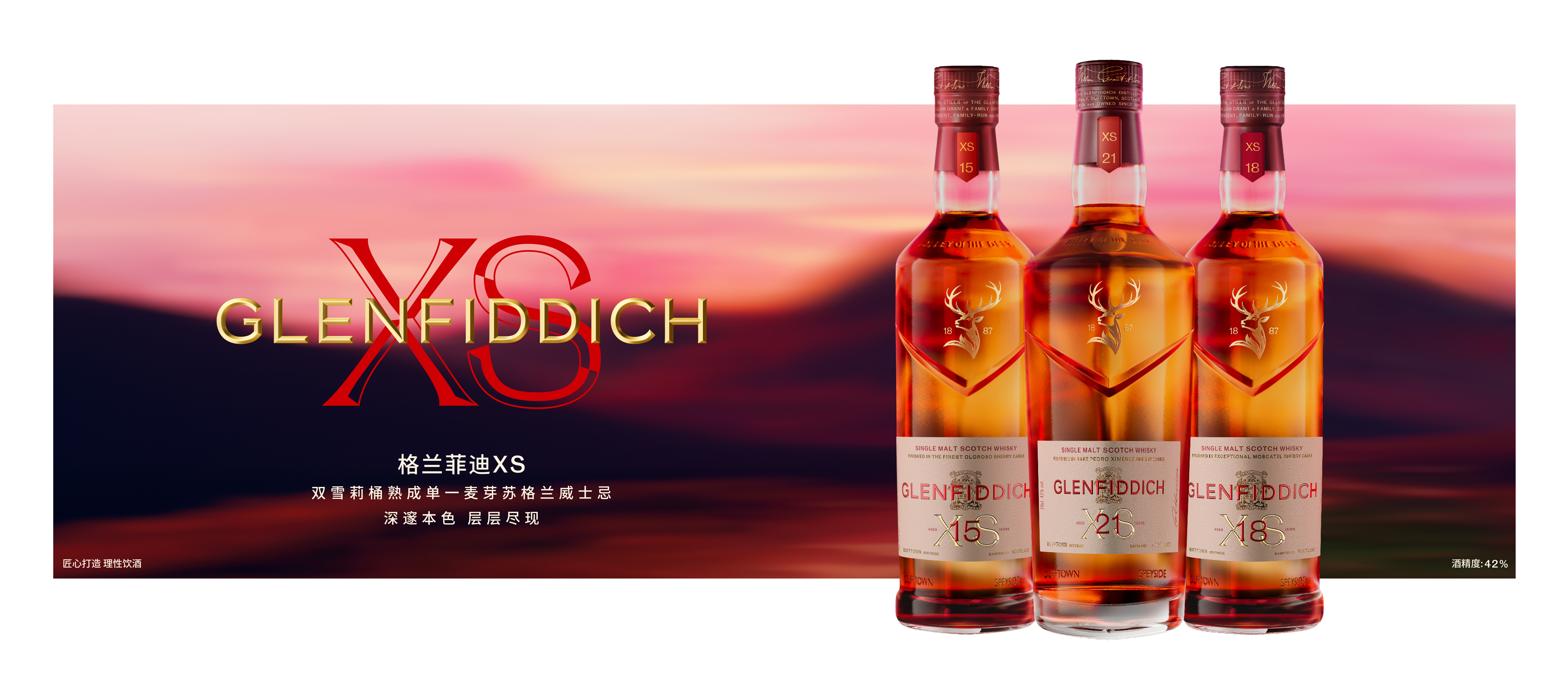 “格兰菲迪XS双雪莉桶系列是一系列风味层层绽放、充满力量的威士忌。它引人探索,也带来更丰盈的品饮体验。多层次的熟化工艺,赋予酒液细腻而复杂的口感,也打开了风味层次的全新境界。”
