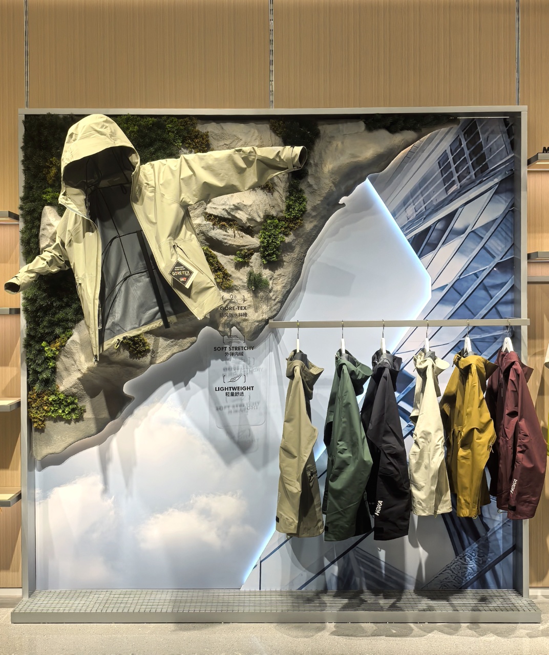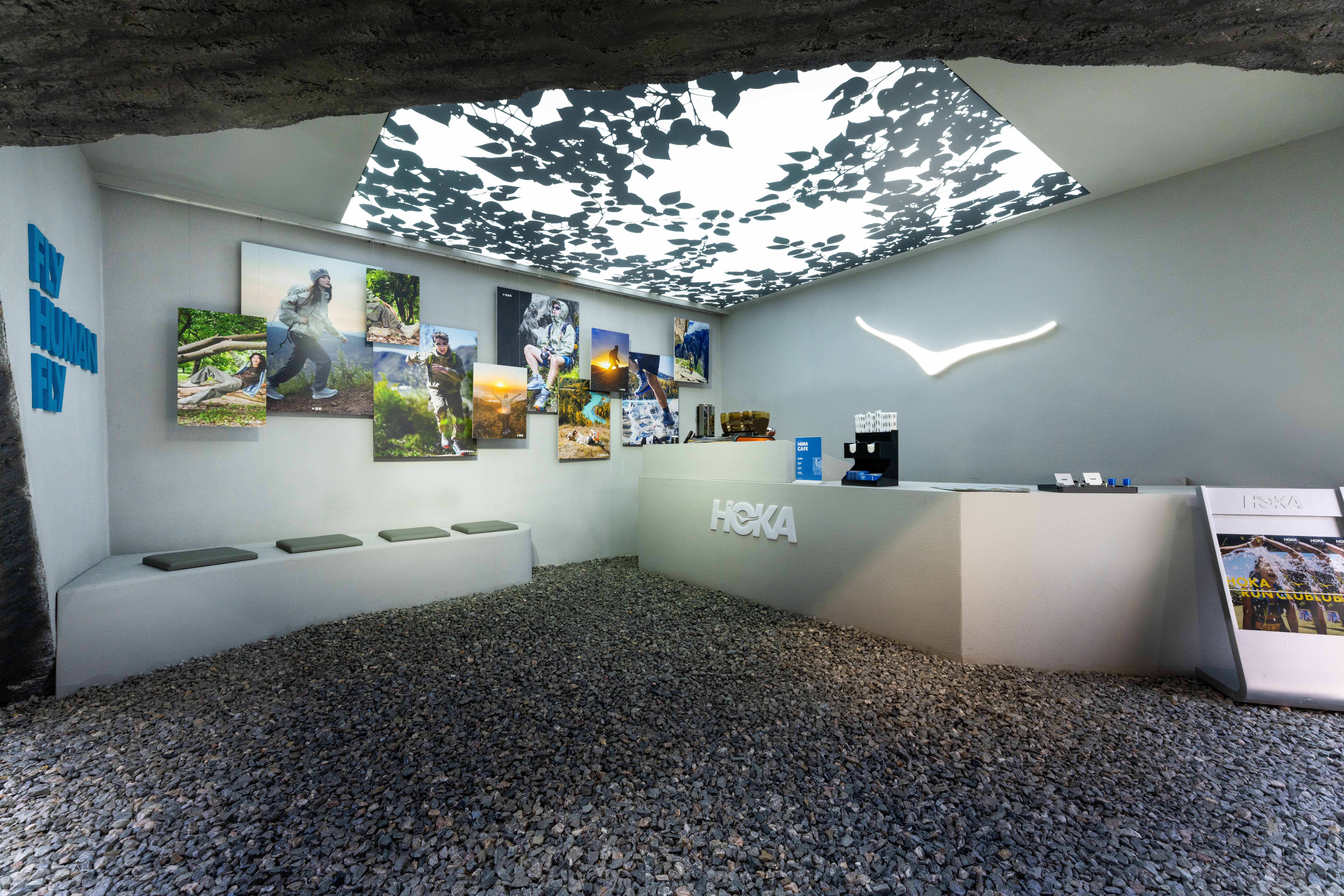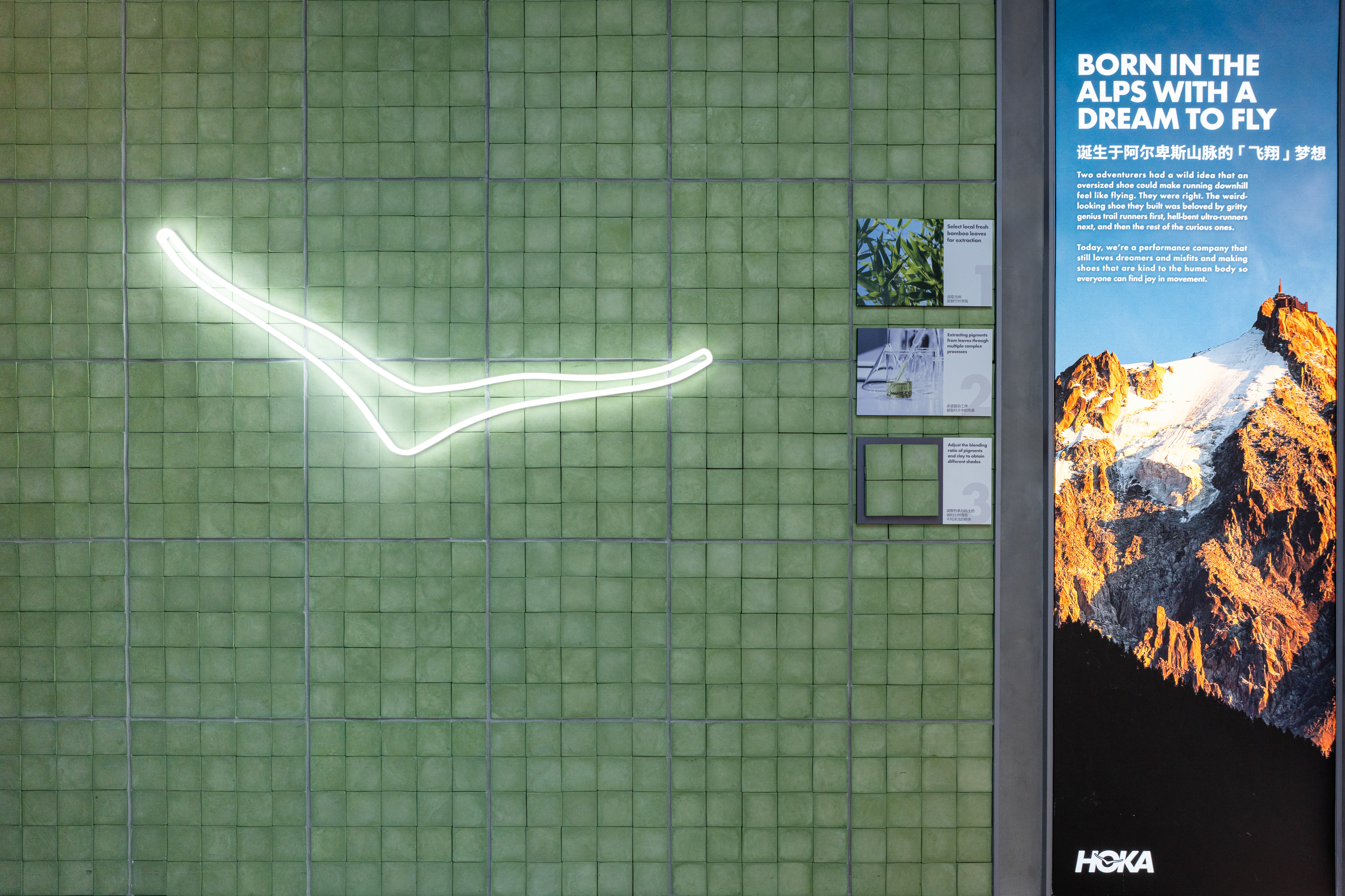 其中,深浅绿意交织的 HOKA 品牌墙格外吸睛 —— 墙面从天然竹叶萃取取色,标志性飞鸟符号跃然其上,不见竹形却满含自然意趣,仿佛飞鸟正振翅飞跃山野。从展柜层板、山体切片到产品陈列,HOKA山野基因贯穿始终,探索者在触摸产品、感受空间时,便能与山野生命力自然而然地同频共振