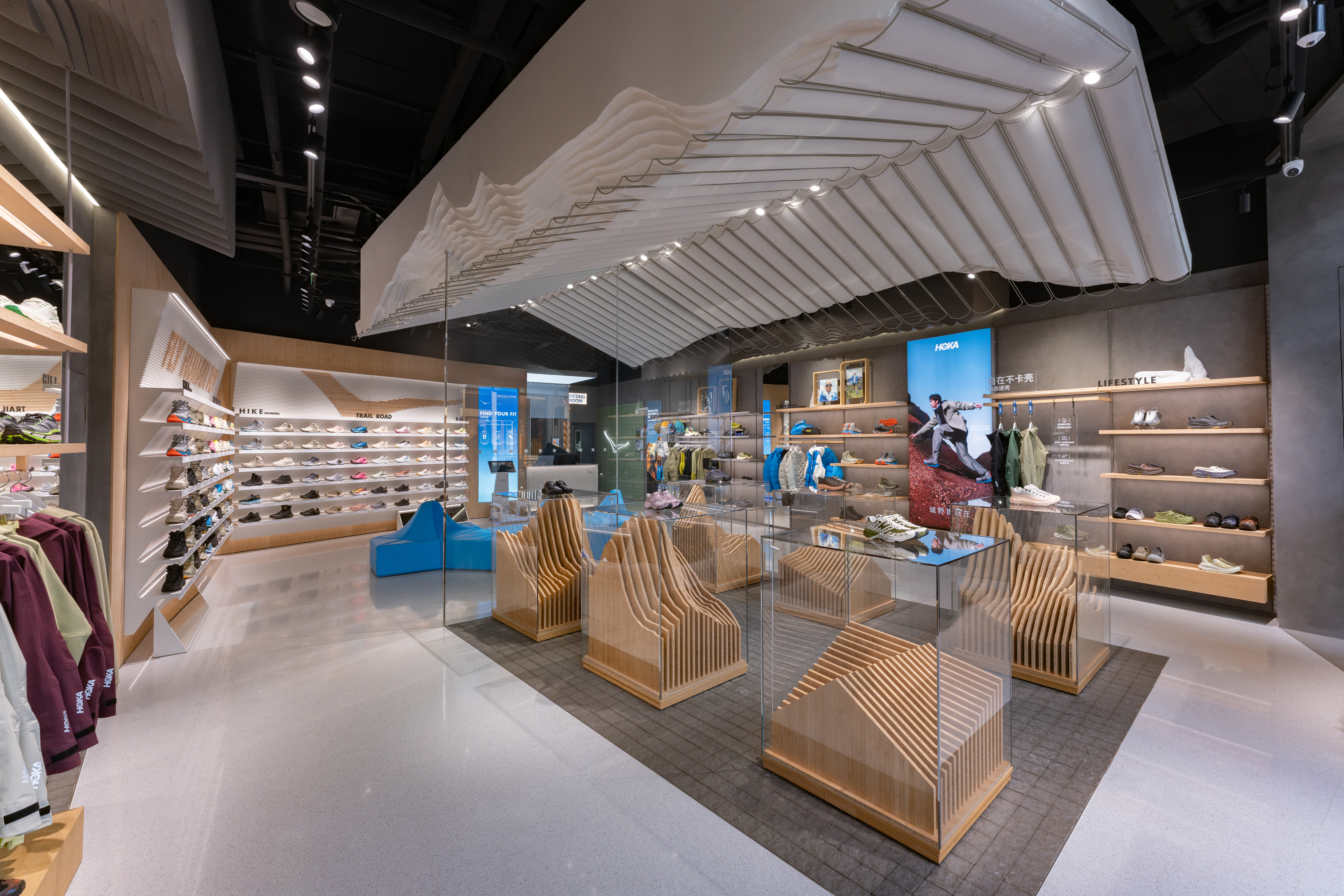 除了此次隆重亮相的「城野穿行」快闪空间,一旁HOKA成都品牌定制概念店亦于 8 月完成全面焕新升级。空间设计深度融合成都当地文化与太古里建筑特色:反转的屋脊线条,既巧妙复刻太古里标志性屋檐形态,又与棱角分明的 山脊造型相嵌;错落排布的 山体切片展柜,搭配温润的原木色调,让每一步游走都宛如穿梭于城市肌理与山野脉络的交界地带,自然营造出 身在城心,如处山野的沉浸式氛围。