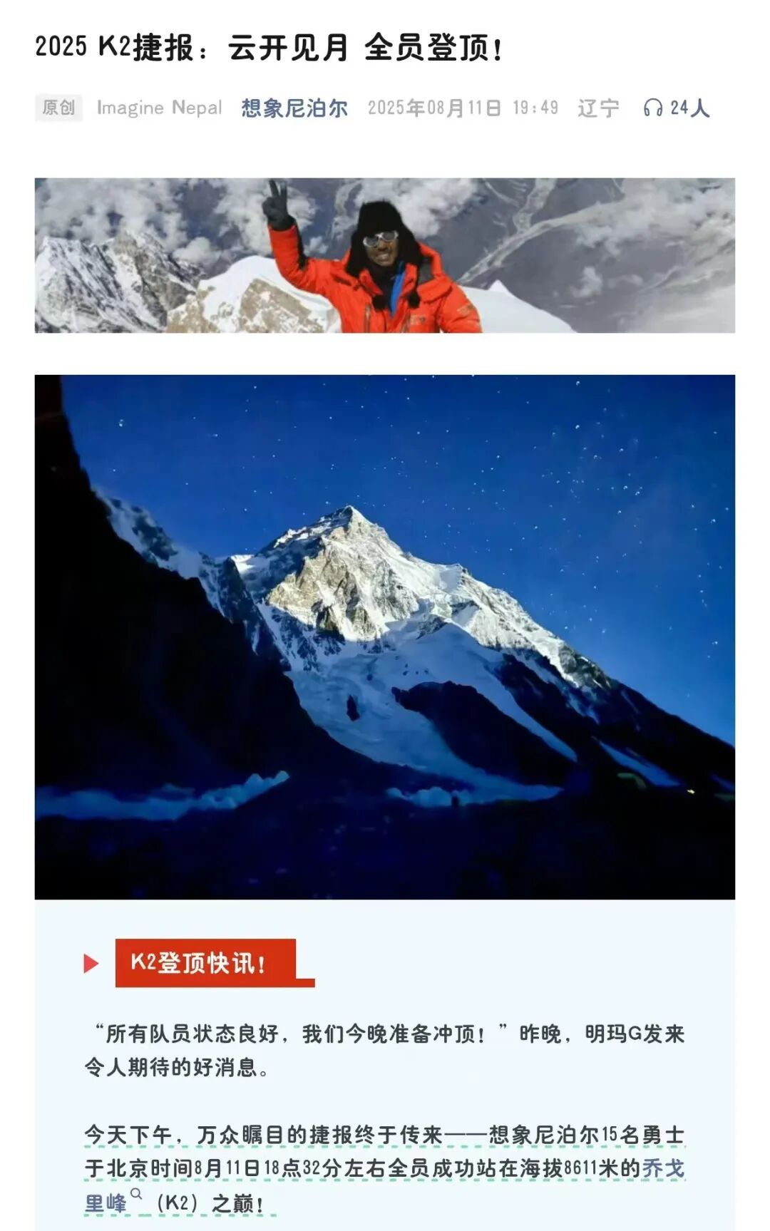 Jacky通过“想象尼泊尔”社交账号发布的捷报,得知了登顶的消息。从11日起,来自至少5支商业登山队、10个国家的登山者和他们的向导,相继登上了这座世界第二高峰。其中17岁的中国新疆少年艾力库提成为最年轻的K2登顶者,土耳其的通巴特、罗马尼亚的达尼拉成为各自国家的K2“女性首登”,斯洛伐克的波拉科娃成为该国第一位无氧登顶的女性。管静是瑜伽老师,她试图在封顶倒立,但没有成功。