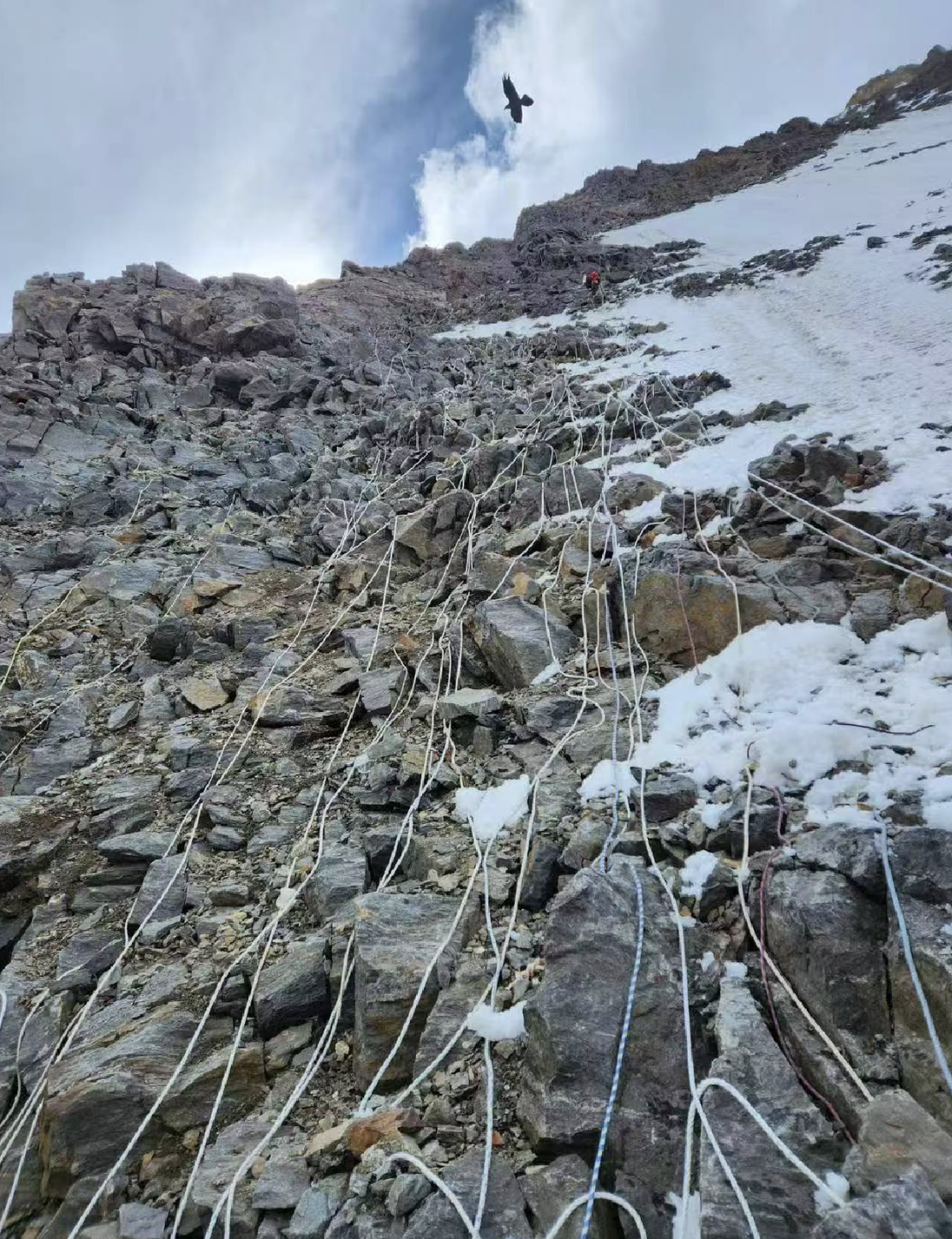 那一刻胡樱虹才意识到,从冲顶到下撤的几天里,山体变化很快:上山时,从1号营地到2号营地都是冰雪岩石混合路段,但下撤时,岩石上的雪都融化了——过去几天气温相对较高,岩石变得更加裸露和破碎。理论上晚上气温降低,山体表面被冻住,落石风险较小,“但(出事后)我向导考虑到,落石这么频繁,夜里又看不见,就更危险,就终止下撤了”。