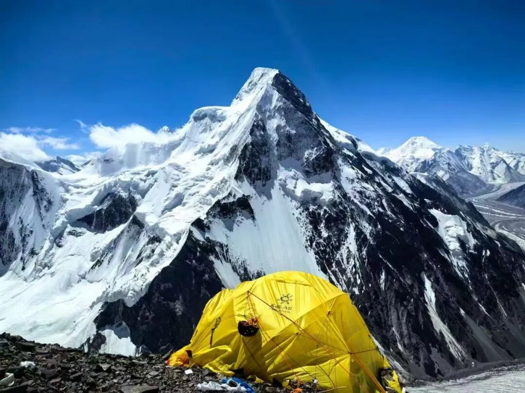 从乔戈里峰的高营可以望见海拔8035米的加舒尔布鲁木 II ,下方是巴尔托洛冰川加舒尔布鲁木冰川(胡樱虹 摄)