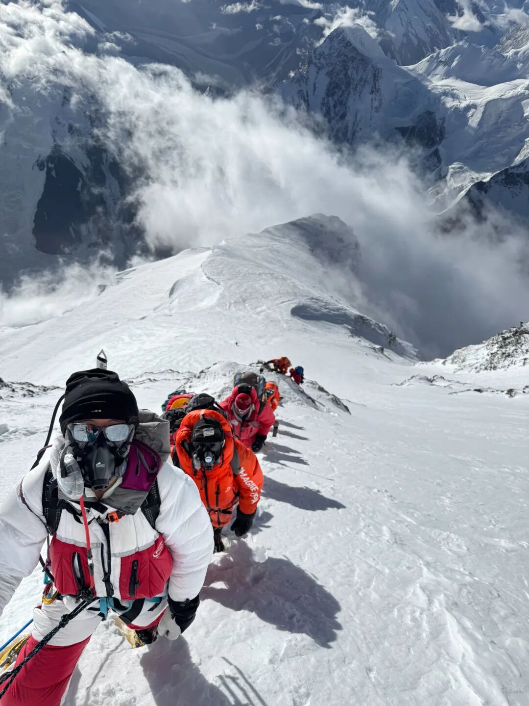 看着眼前的妻子,Jacky觉得像在做梦。妻子是85日,跟着尼泊尔登山家明玛G带领的登山队,从乔戈里峰大本营出发冲顶的。811日傍晚6:32左右,管静站在了海拔8611米的乔戈里峰(K2)峰顶。她拿着手机拍下四周的景色:峰顶下方,一边是中国新疆,另一边是巴基斯坦,喀喇昆仑群山和冰川在云海中若隐若现。
