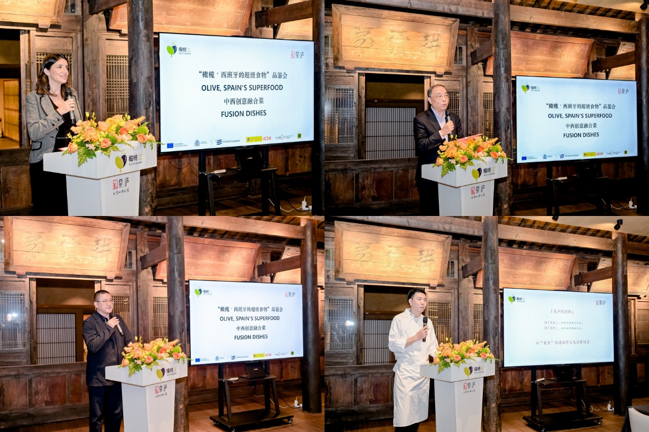 来自西班牙大使馆的经济商务参赞Estefania Roncero Fernández(荣帆女士)、世界中餐业联合会邢颖会长、粲庐文化董事长廖成先生与主理人沈贤斌主厨齐聚一堂,话题自然围绕着西班牙橄榄展开——这种来自地中海沿岸的果实,如何与中国餐桌产生新的联结。