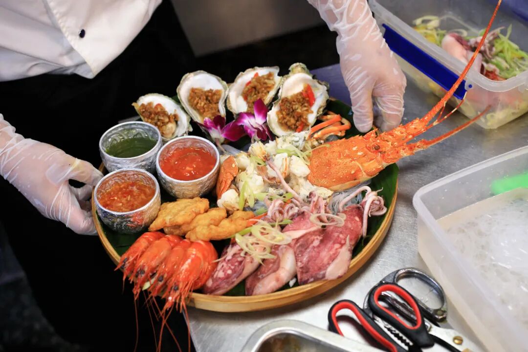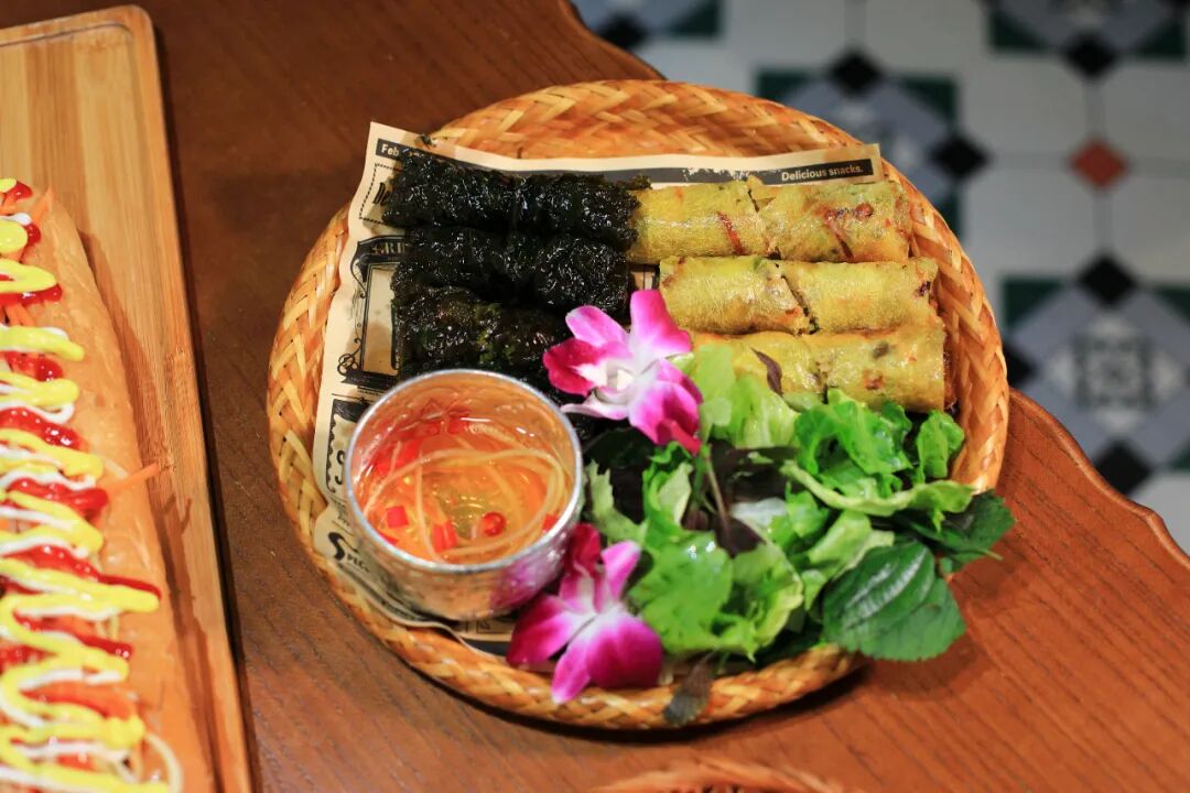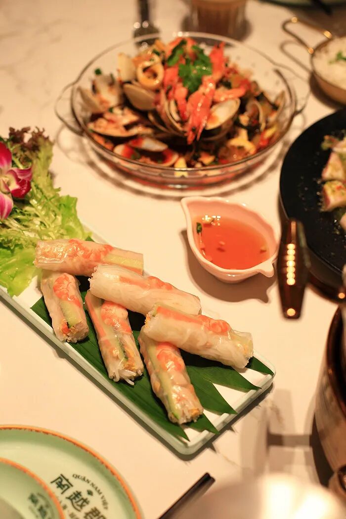 簸箕拼盘里必包含越南最有名气的街头小吃炸春卷。距离东兴口岸大桥只有几百米远的禧越餐厅里,春卷都是越南大姐每天早上现包的,甚至连材料也是她们直接从越南带过来的。
