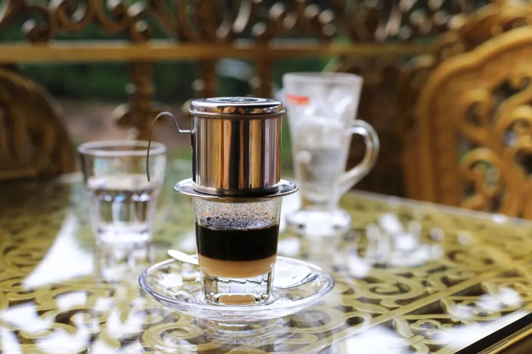 他邀请我们坐在小楼三层的半露天阳台上喝一杯越式滴漏咖啡。制作咖啡用的是透明玻璃做的一套托盘和小口杯,杯底放了一层自行研发的降甜度的炼乳,杯口上架着铝制的滴漏器,深褐色的咖啡液正不断地滴落在炼乳之上。滴漏咖啡是越南最具标志性的咖啡取用方式,小小的滴漏器设计得很有意思,压在咖啡粉上面的压板分水器有个方便手抓的长柄,当分水器逐渐沉到滴漏器底部时,长柄慢慢下滑,才让顶盖缓缓地落下,将滴漏器盖严。它就像一个计时器一样,提醒着客人滴漏已经完成。