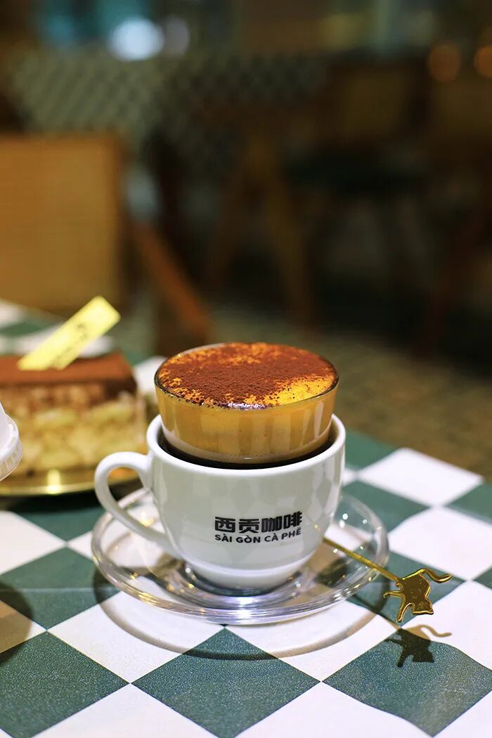 鸡蛋咖啡是把无菌生鸡蛋黄打发之后,盖在炼乳和意式浓缩咖啡上面替代牛奶奶泡的。鸡蛋咖啡会套着一杯热水保温,店员告诉我,他们通常建议客人拍完照立马喝,“蛋液凉了可能会有腥味”。如果喜欢喝冰咖啡,也可以试试越南流行的另一种咸奶油咖啡,同样用的是咖啡机萃取出的咖啡液,跟炼乳搅拌均匀后加入大量冰块,再在上面加一层加了盐的奶盖,喝起来“咸咸甜甜的”,非常受年轻人的欢迎。