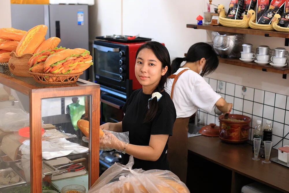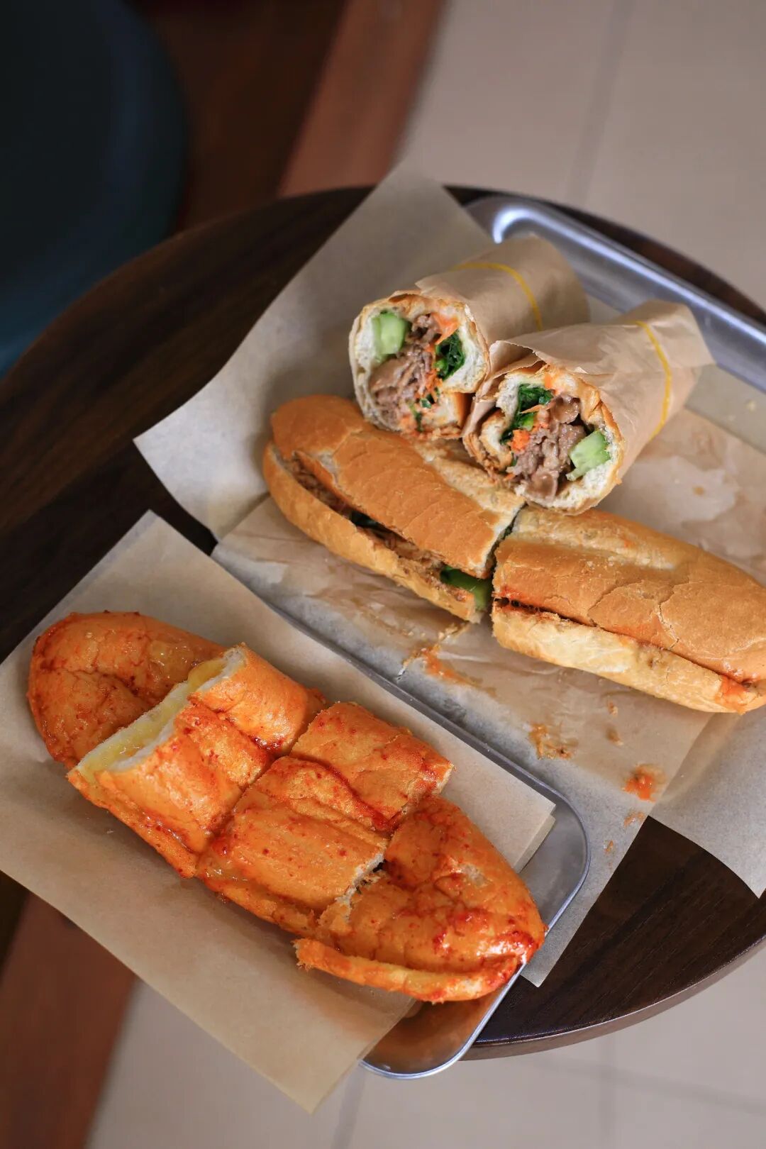 东兴国门景区边上的雪贞的面包店,店主阮氏雪贞是越南芒街姑娘,她店里的面包馅料融合了中越两国的口感。我们尝了传统河内面包、黑胡椒牛肉面包和她原创的椒盐酱面包。传统河内面包里的猪肝酱和炖黑胡椒牛肉都是雪贞每天不断熬制的。“配方没什么特别之处,跟大家都是一样的。”雪贞说。各家的不同来自于蛋黄酱、番茄酱等配料,都是买来初产品再加入自己的独特配方重新制作出来的。她会在馅料里再加上胡萝卜丝和木瓜丝,传统河内面包里还会加自制肉肠,以及解腻的鹅芥。唯有椒盐酱面包比较特殊,只刷特调的蛋黄酱和自制辣椒酱,把面包刷得油亮,再放进烤箱里加热后吃。雪贞说,椒盐酱面包一推出就火了,这种微咸微辣的三明治面包很符合中国人的口味。