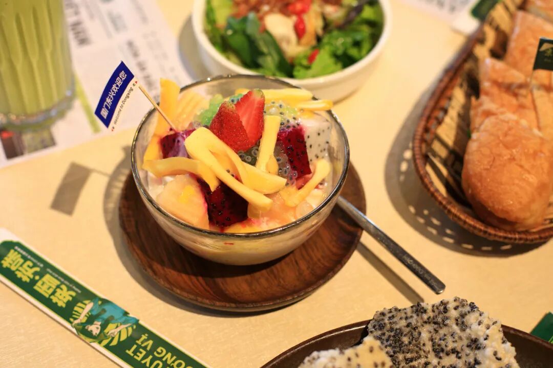 后来在英雪·芳味美食馆吃店里的越南甜品时,也因为食材的意想不到,产生了不同的感觉。老板吴金芳是做果汁起家的。5岁时她的父母离婚,她跟着母亲从河内来到东兴,初中没读完就出来摆摊卖果汁,用的都是当时国内没有的越南水果,生意非常红火。“最受欢迎的是芒果、百香果、椰子、柠檬,是越南阿姨划着小船过来卖的,相比之下榴莲本地人反倒不怎么喜欢。”吴金芳告诉我,因为经常回越南看父亲,顺道就积累起越南糖水的各种门道来,“越南糖水常常用到椰奶、椰丝、椰脆,还可以制作柠檬酸奶、芒果冰沙等”。她店里有道越南水果捞也是色彩缤纷的一道招牌甜品,用到了12种水果,但最核心的是自己研究的一种椰子酱,“里面用了菠萝蜜和椰肉,打碎之后跟椰脆一起熬”。