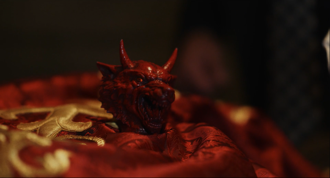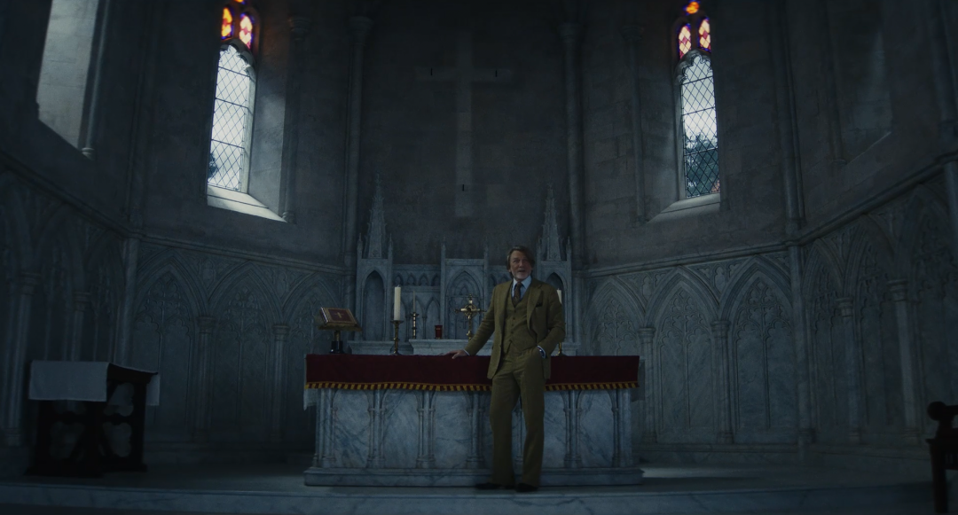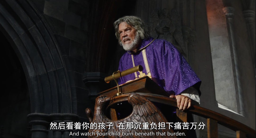 在氛围营造上,电影也继承了卡尔的哥特式审美。大量对称式的远景构图、明暗对比强烈的打光,还有低沉肃穆的配乐都让第三部更加黑暗厚重,和前两部艳丽跳跃的影像风格形成了差异化。