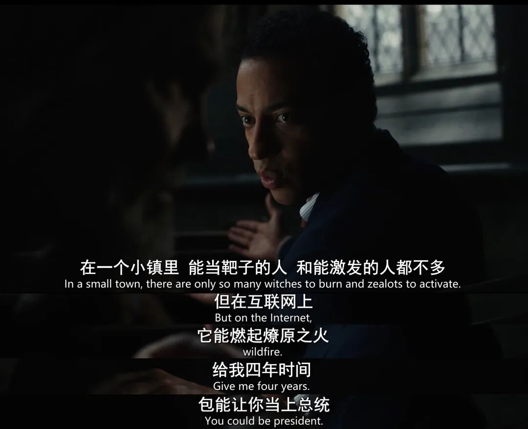 短短半分钟的对白足以让人一窥当下美国社会的撕裂:不同阶层有着难以调和的各种冲突,而政治家为了选票从来不吝于煽动对立、制造更多仇恨和思想极化,让人们更难彼此信任和团结。这恰恰也是威克斯对信徒们所做的事,赛正是看到了这点,才鼓动威克斯投身政界。