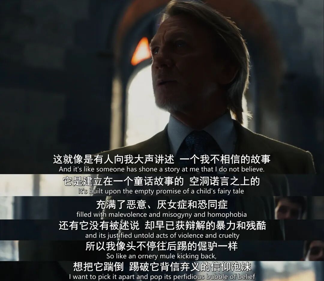 《利刃出鞘》系列一直以来都会在案件中融入社会议题的讨论,第一部是移民政策,第二部是科技巨头的道德问题,第三部则把焦点放在了对信仰的讨论上,展现的深度和层次堪称系列最佳。