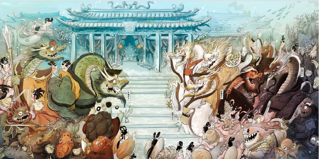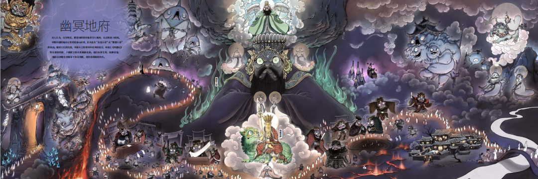 “天庭神官”章的配图就是天庭的俯瞰图:从四御大帝如何执掌三界秩序、太上老君如何捧册持诏,传布天庭敕令,到风伯雨师如何布雨兴风。理清那等级森严、各安其职的天庭组织构架。