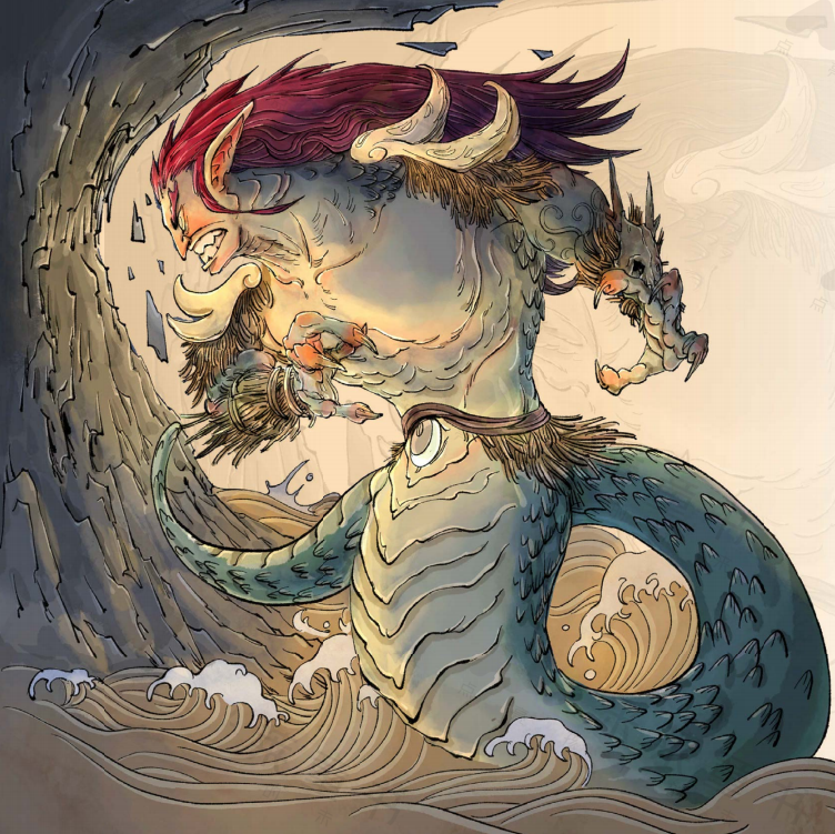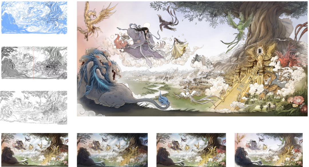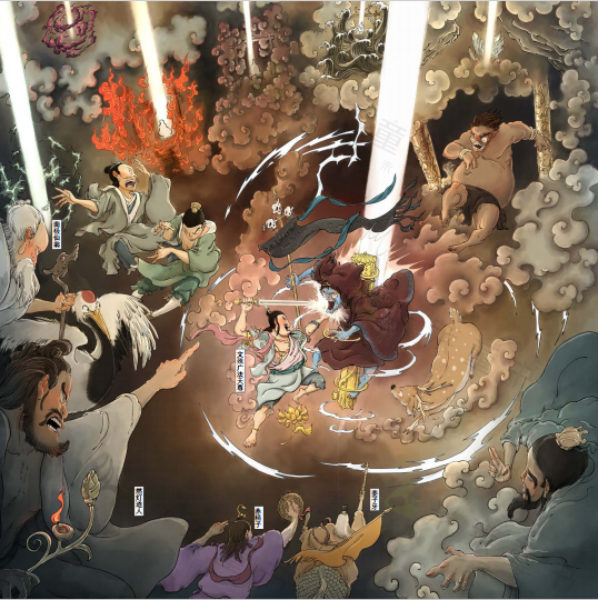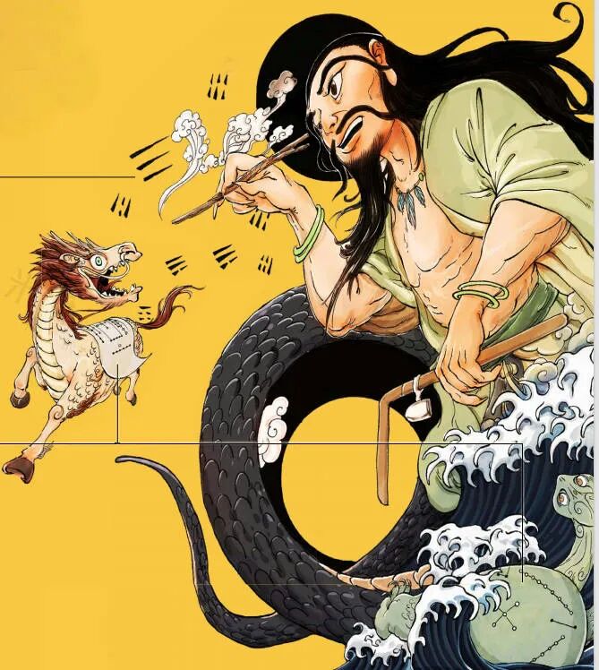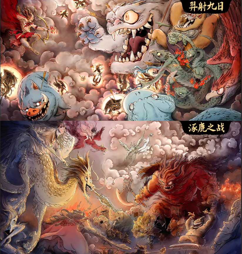 插画师江湖老师创作的每个角色,都会查阅大量文献,尽可能以古籍经典中的描述为基础进行创作,淋漓尽致地体现出了匠人精神。比如共工的形象塑造,融合了多部文献的记载。构图上,参考《淮南子》中