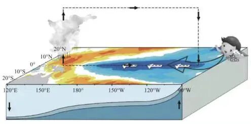 东太平洋的海水向西流,强烈的阳光照射下不断加温,来到西太平洋,形成的是世界上海温最高的一大片水体——西太平洋暖水团。暖水团上面暖空气上升,冷水团上冷空气下沉,赤道附近的东西太平洋,于是形成了一个闭合的空气环流,这个环流也被称为沃克环流,是20世纪初英国科学家沃克发现的。