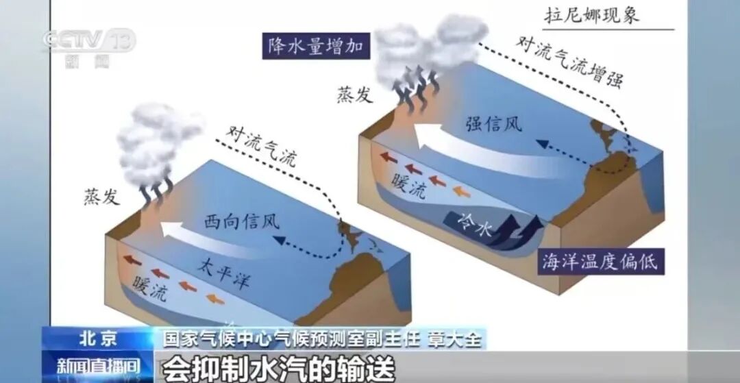 当拉尼娜到来,赤道东太平洋海温异常偏低时,东西太平洋海温差进一步扩大,沃克环流强度是增强的。拉尼娜事件在我国的表现,往往是冬季更寒冷,寒潮频发;夏季长江流域易干旱,华北、东北降水偏多。其背后的机理,可以这样理解:夏季,当沃克环流增强时,赤道海水被更快地向西吹,西太平洋暖池的增暖效应进一步放大,为亚洲季风区提供了更充足的水汽和能量来源,季风变得更强盛更为深入,以至于北方雨水多,南方反而被错过。冬季,西太平洋强对流上升的空气,在高空向中高纬度扩散,会直接干扰中纬度西风带的稳定度,为寒潮、冷空气南下创造条件。