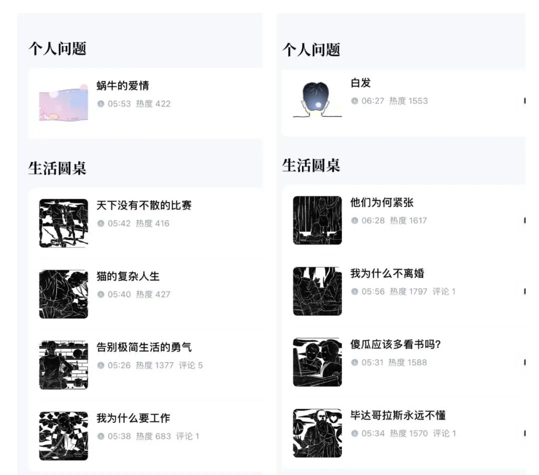 当然,在这些深度话题之外,“生活圆桌”“个人问题”栏目还为你提供了一个观察他人生活的通道。