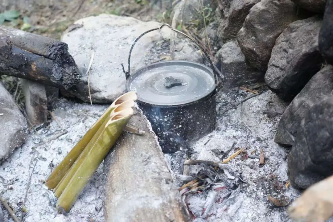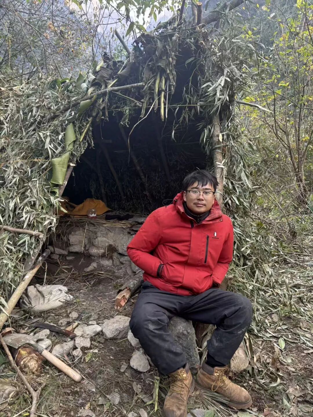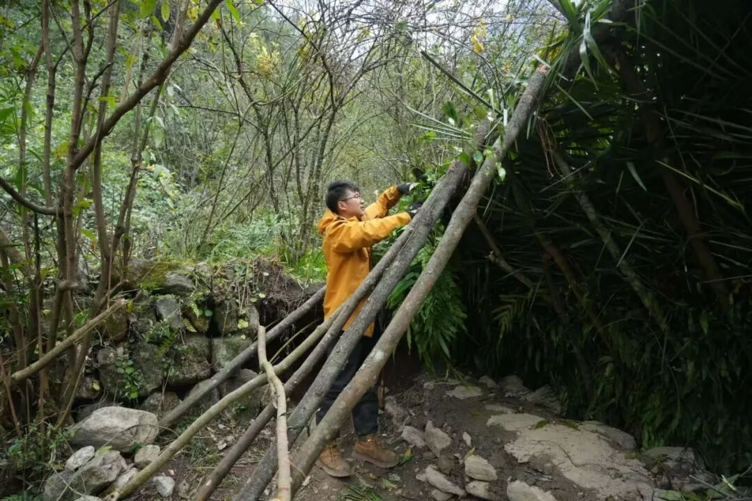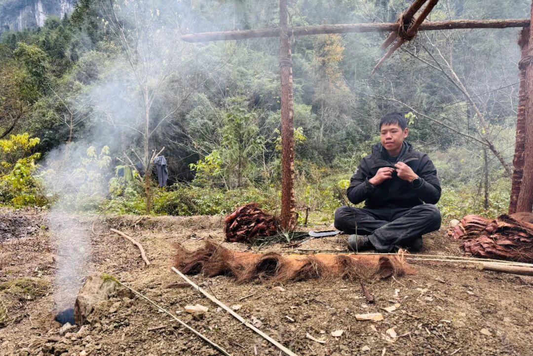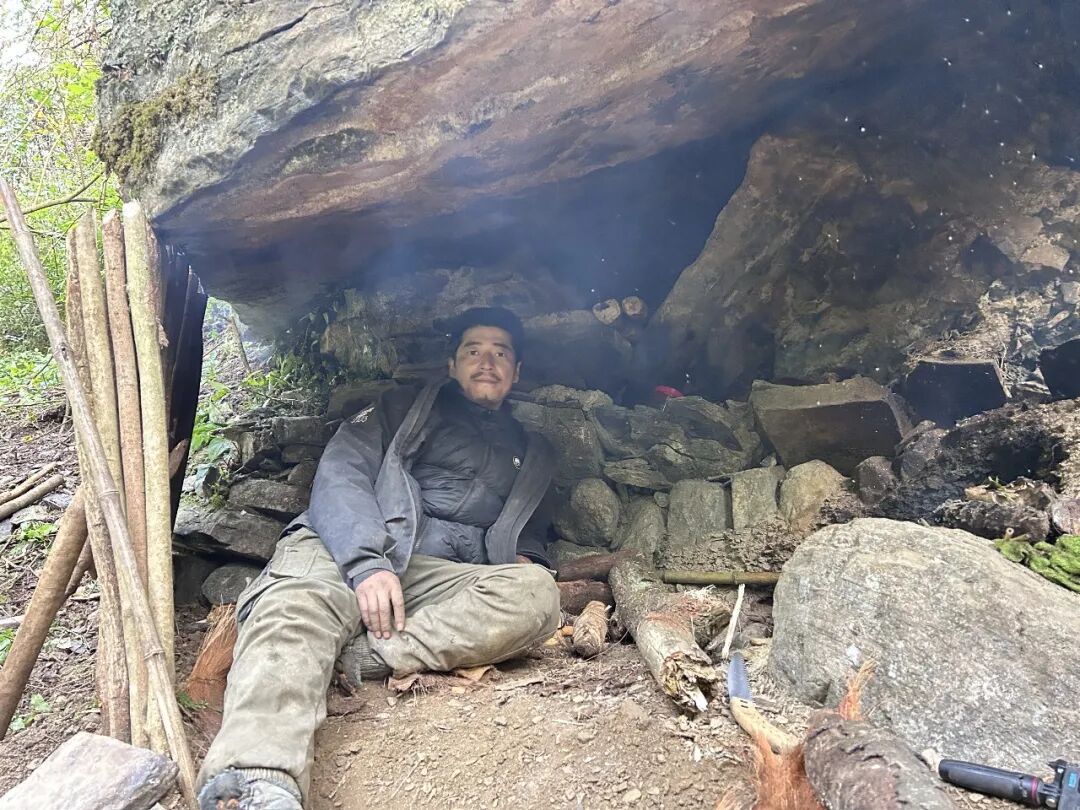 孙高的庇护所在溪流下游边上的平地,“人字形”结构,上面覆盖了好几种植物,厚厚一层,门前摆放着许多柴火。他叫不出这些植物的名字,只是觉得它们能够遮风挡雨,就堆了上去。孙高回庇护所的第一件事是检查火种,确认没有灭后,他戴上了手套,把木头拿出来一点,用一根空心的竹筒把火吹得更旺。孙高很珍惜火。比赛开始前,主办方组织过钻木取火的培训,但他作为“荒野小白”,短时间内没能领会到钻木取火的诀窍,后来遇到连绵的雨和阴天,更是生不起来火。天晴以后已经是第20天,生火讲究爆发力,要有速度、力量和持久力,但因为缺乏食物,孙高那时体重骤降,已经没什么力气。后来又连日阴雨,他干脆硬扛进了决赛。