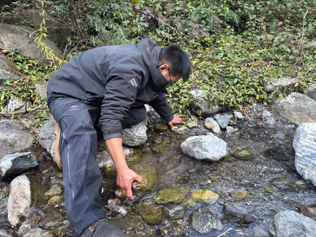 12月6日下午,本刊记者见到孙高的时候,他正在小溪中寻找螃蟹。这次比赛,每个选手都给自己起了绰号,孙高的绰号是“道友”。他今年34岁,身高超过一米七,穿一身黑色衣服。他单眼皮,戴眼镜,笑起来露出一排整齐的牙齿,讲话幽默,语气和善。“大石头下面一般有大螃蟹,小石头下面一般是小螃蟹。水缓的地方更多。”说着他就搬开一块大石头,找到了一只半个拇指大的螃蟹,他说这就是大螃蟹,小的只有指甲盖那么大。“我就感觉这里有!”他得意地说自己从午饭后就开始抓螃蟹,已经抓了20多只。