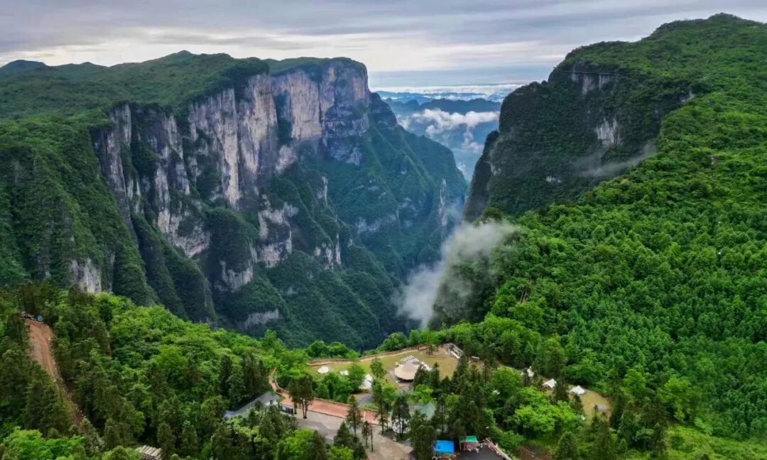 从张家界市区往南开,一路都是远山绵延起伏的轮廓,12月4日这天是阴天,云雾缭绕,像一幅水墨画。20分钟车程,看到“七星山”三个红色大字时,就到了七星山景区的游客中心。浅米色和浅卡其色的中式风格建筑连成一排,如同背后高山的注脚。景区的工作人员告诉我,七星山顶部有七座较高的山峰,与北斗七星相对应,故得名“七星山”,最高海拔1528.6米。一条长2000多米、上下水平高差700多米的索道是游客进入七星山的唯一途径。