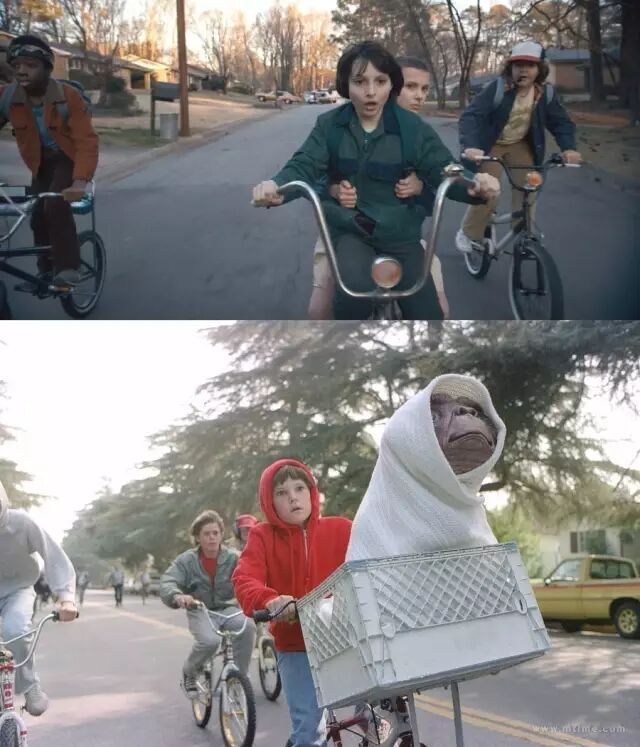 《怪奇物语》中处处充满着对两位大师的致敬:少年在小镇上对抗超自然力量的主线结构来自《小丑回魂》;主角团骑自行车带艾尔逃避军方追捕的场面是致敬《ET外星人》;小镇居民被无形怪物拖走的场面则满是《大白鲨》的惊悚感。