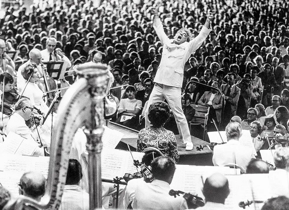 马勒能够追求这样一种“人性节日”的群体音乐,而克服德意志民族主义和布尔乔亚的束缚。虽然在反犹的奥匈帝国,他为了事业不得不皈依天主教,但他使用天主教的主题和材料,却非以特定宗教为圭臬。自由探索和提升人类生命,这种普世倾向,冲击着在宗教和阶级下越来越僵硬的德语世界。马勒,一个德语犹太作曲家,重新激活了歌德的人性宇宙观,甚至让它具有了二十世纪生命哲学的质感。而在二十世纪中后期,另一位犹太音乐家伯恩斯坦倾心于马勒作品,他指挥的《第八交响曲》让这部作品终于回到了维也纳爱乐的怀抱,成为经典,这其中也一定包含了精神联系。在“永恒之女性”终于出现时,伯恩斯坦已大汗淋漓,但那种全身心的狂喜乃至灵魂出窍的状态,仿佛大地、原野、海洋、人的幸福在宇宙之诗中不断扩展,这的确是对马勒的精彩诠释。