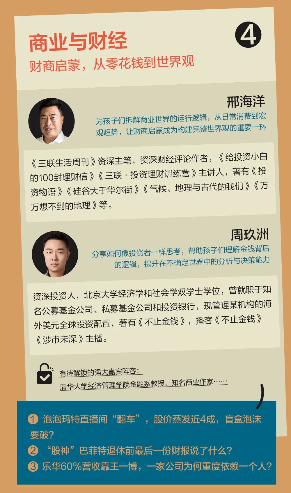 “财经与商业”板块,将从孩子熟悉的日常消费与职业现象入手,逐步展开对经济逻辑与社会结构的认知。我们注重培养理性的财富观念与判断力,也希望传递三联一贯的人文经济视角——经济不仅是数字,更是人的生活与选择。常驻嘉宾之一包括《三联生活周刊》经济类资深主笔邢海洋。以及资深投资人周玖洲,他将从经济学与社会学的双重视角解读商业世界的运行逻辑。