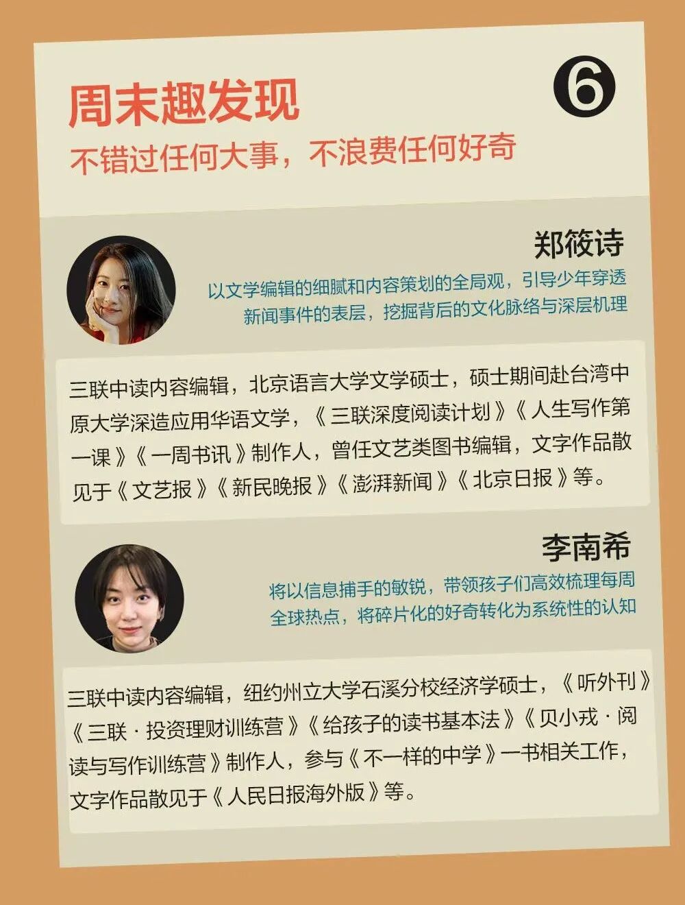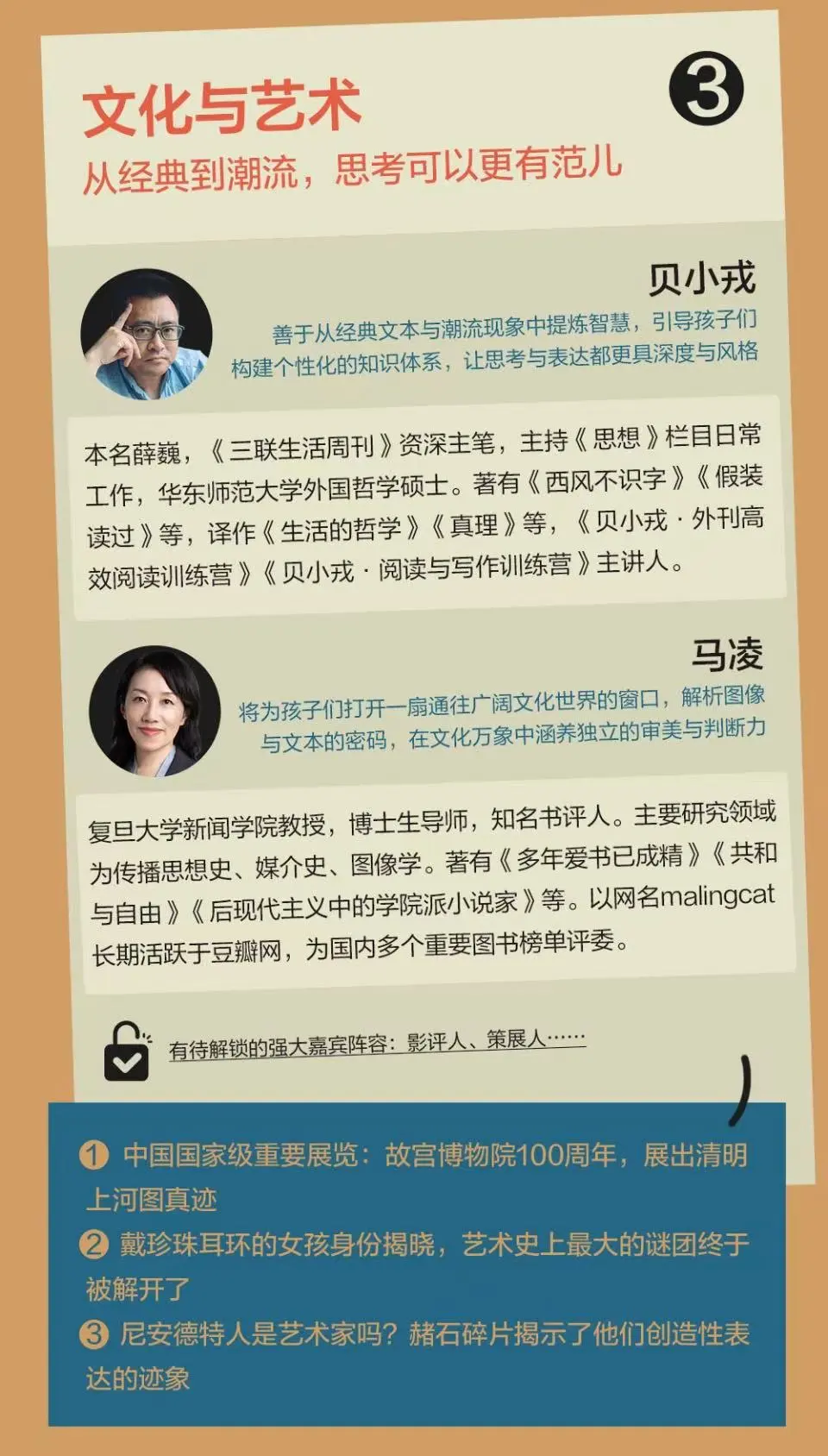 “文化与艺术”板块,是三联人文底色的集中呈现。我们将不局限于经典或流行,而是通过影视、展览、文学等多元载体,引导孩子在审美体验中发展独立思考与文化感知的能力。常驻嘉宾之一有资深主笔贝小戎,将从哲学与社会学角度切入,训练孩子拆解复杂文化现象;复旦大学教授马凌则以她深厚的学养与鲜明的风格,带领大家读懂艺术与流行背后的时代情绪。