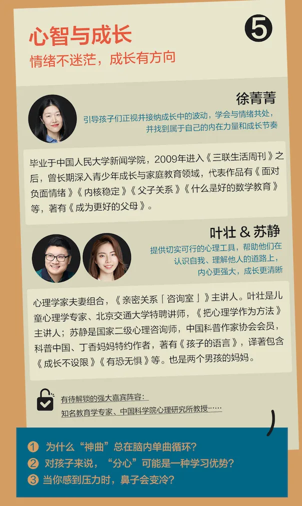“心智与成长”板块,关注的是每个少年内在世界的波澜与秩序。我们相信,认识自我与理解他人,是成长中最核心的课题。这一部分的常驻嘉宾之一是《三联生活周刊》资深主笔徐菁菁,她长期关注国际新闻与医疗健康领域;同时还有心理学家夫妻组合叶壮与苏静,他们都是专业的心理咨询师,将从专业视角与生活经验出发,陪伴孩子走过情绪起伏与认知发展的关键阶段。