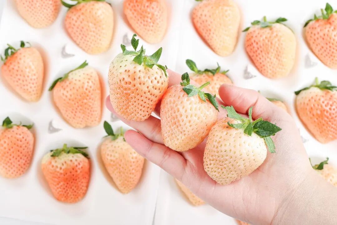 拿淡雪草莓举例,它并不是我们印象里纯白的草莓,比完全雪白和微微透粉的白草莓来说,淡雪草莓是纯度更高的橘粉色白草莓,看起来像珠宝一样闪闪发光。