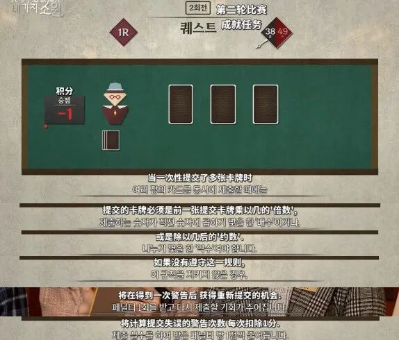 譬如第二轮“成就任务”的比赛,玩法是玩家用数字卡牌进行对决。游戏分三个回合进行,第一回合中,每位玩家随机分配七张互不重复的数字卡,想要对决的玩家可以走进交易屋,各自秘密提交一张卡牌比大小,卡牌较小的玩家扣一分,否则加一分。玩家可以一次性提交多张卡牌,前提是必须满足一定的数学关系——后一张的数字必须是前一张的倍数或者约数。如果顺序错误,就会受到扣一分的惩罚,并需要重新提交。