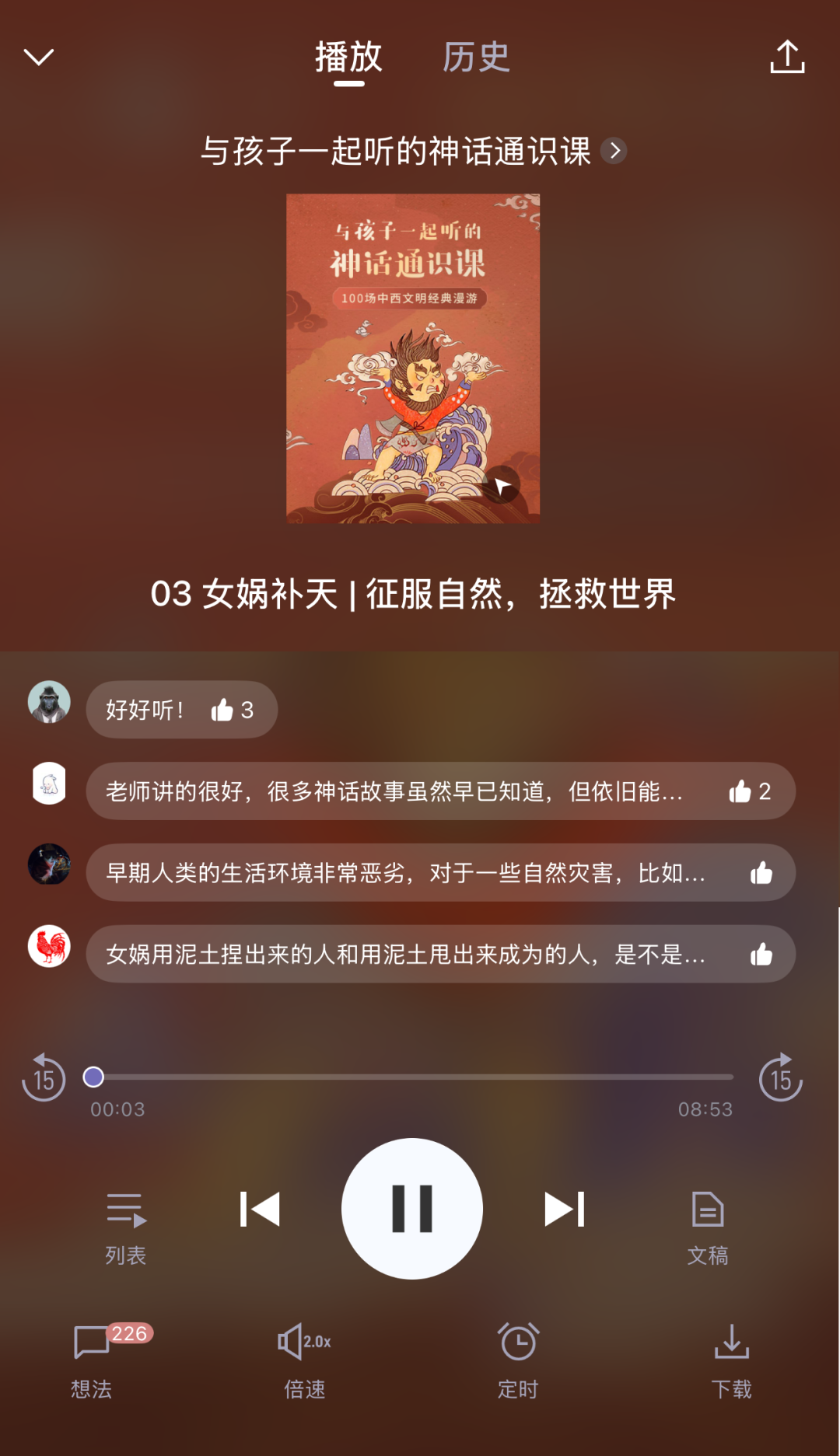 主讲人王叡博士,用50讲就把中国神话讲活了:盘古怎么开的天、女娲为什么造人、伏羲怎样画八卦……被她一讲,孩子听得眼睛发亮。