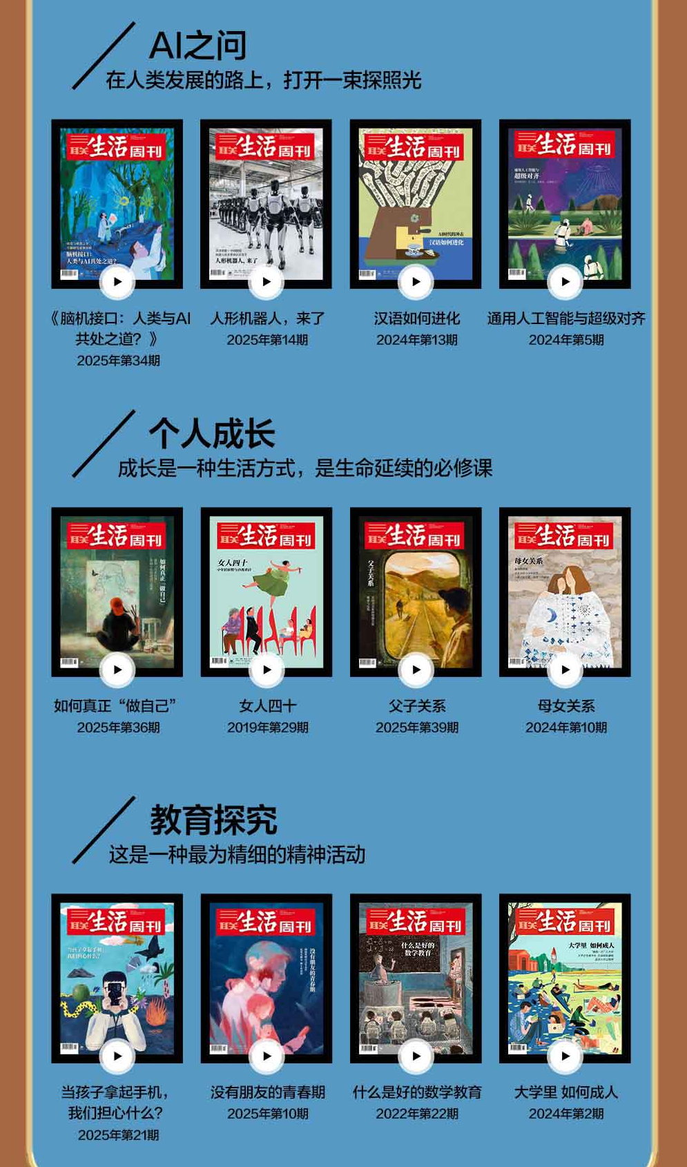 年龄焦虑、育儿难题、婚姻经营……这些我们这代人躲不开的内外困境,三联都会当成一个个严肃的议题去深挖。几万字读下来,原本模糊的焦虑,往往会被拆解成一个个可以着手去做的具体动作。