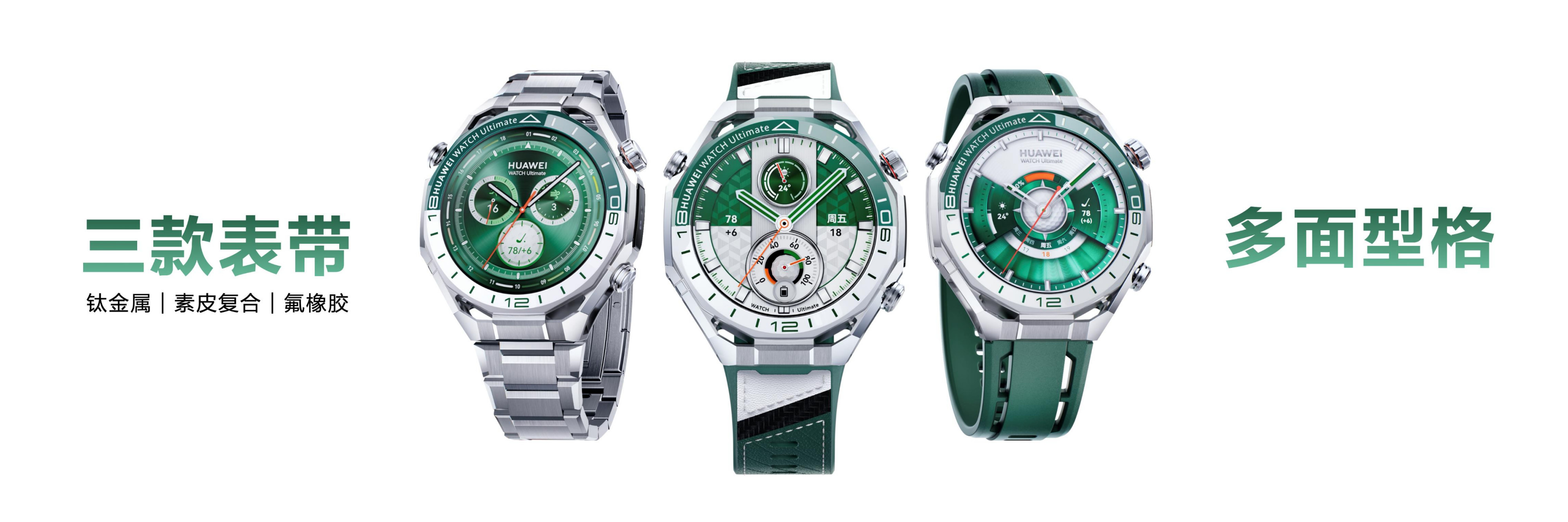 高端人士对腕表的需求,是既能适配多场景穿搭,又能彰显自身品味。华为WATCH Ultimate 2 非凡探索 旷野绿以自然原野为设计灵感,将生机与高端质感融合,极具辨识度。表壳采用非晶锆合金搭配超硬镀膜,兼具耐磨性与细腻金属质感;表圈为双色纳米微晶陶瓷,字符刻度融入百年珐琅工艺,绿白双色清新沉稳,既契合高尔夫运动的优雅,也适配商务、休闲等场景。蓝宝石玻璃表镜通透抗刮,户外佩戴无惧磕碰。新品配备素皮复合、钛金属、绿色氟橡胶三款可切换表带,用户可根据赛场、训练、休闲场景自由切换,兼顾实用与穿搭格调。