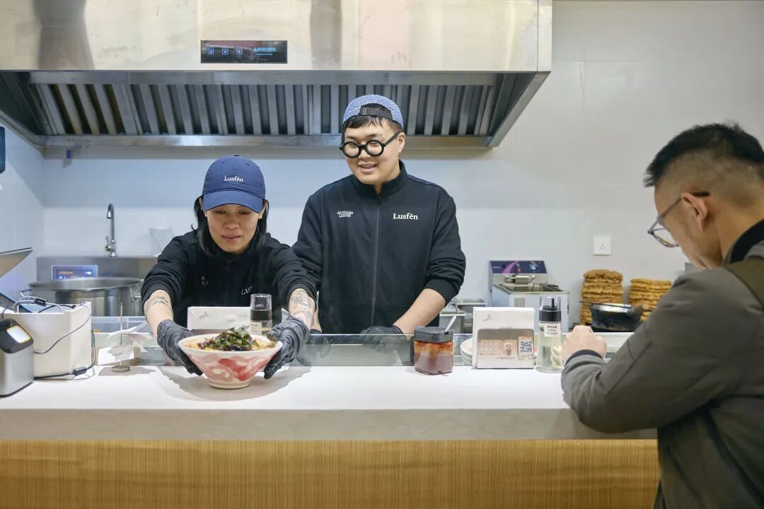 上海“陆丝芬”螺蛳粉店老板高颖(左)和店员小胖