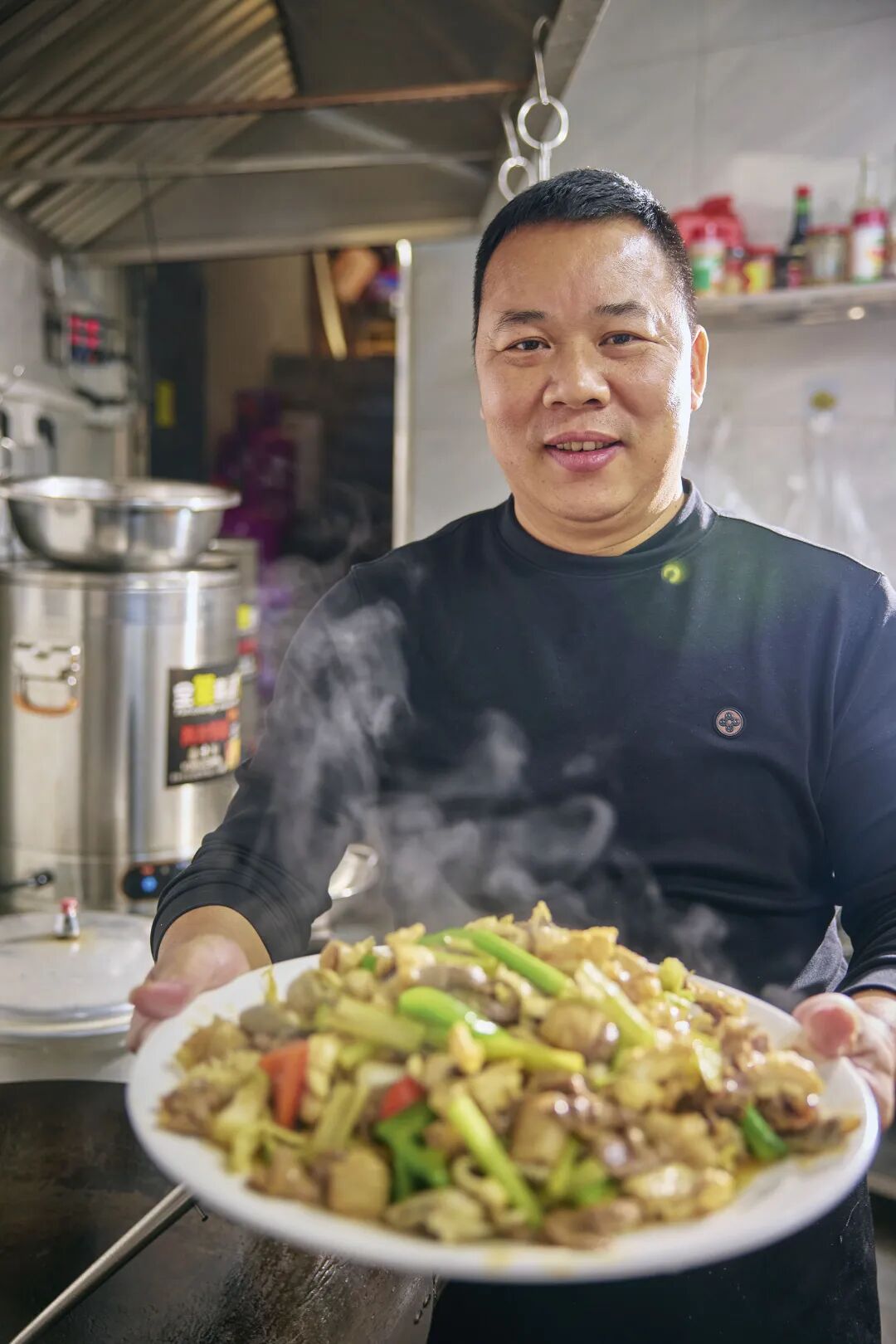 他觉得爆炒跟牛杂特别搭。“不是什么材料都可以做爆炒的,比如青菜,含水量很大,永远炒不干。牛杂就特别合适。过去人们吃烫的牛杂,吃的是里面的鲜甜味。现在用爆炒,把味道快速呛到食材里,这样既能吃到鲜甜味,还能吃到锅气带来的油香味,同时还可以在里面加辣和别的味道,能受年轻人喜欢绝对是有原因的。”