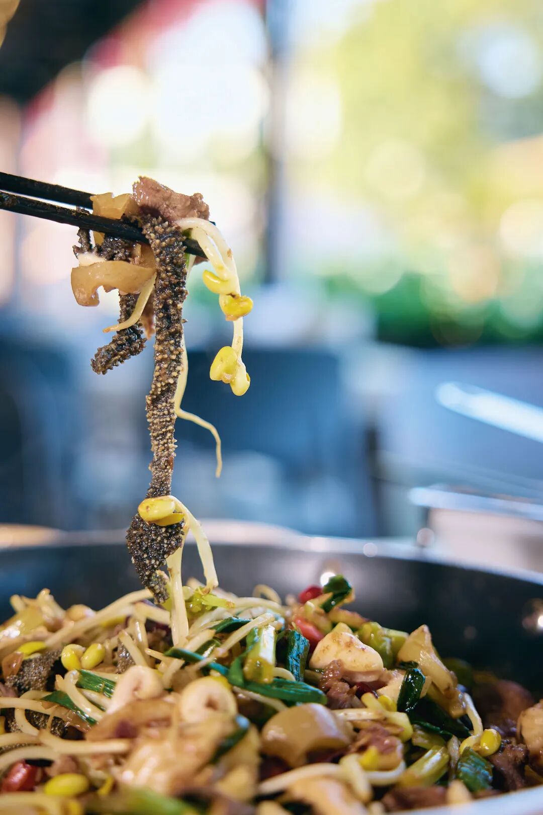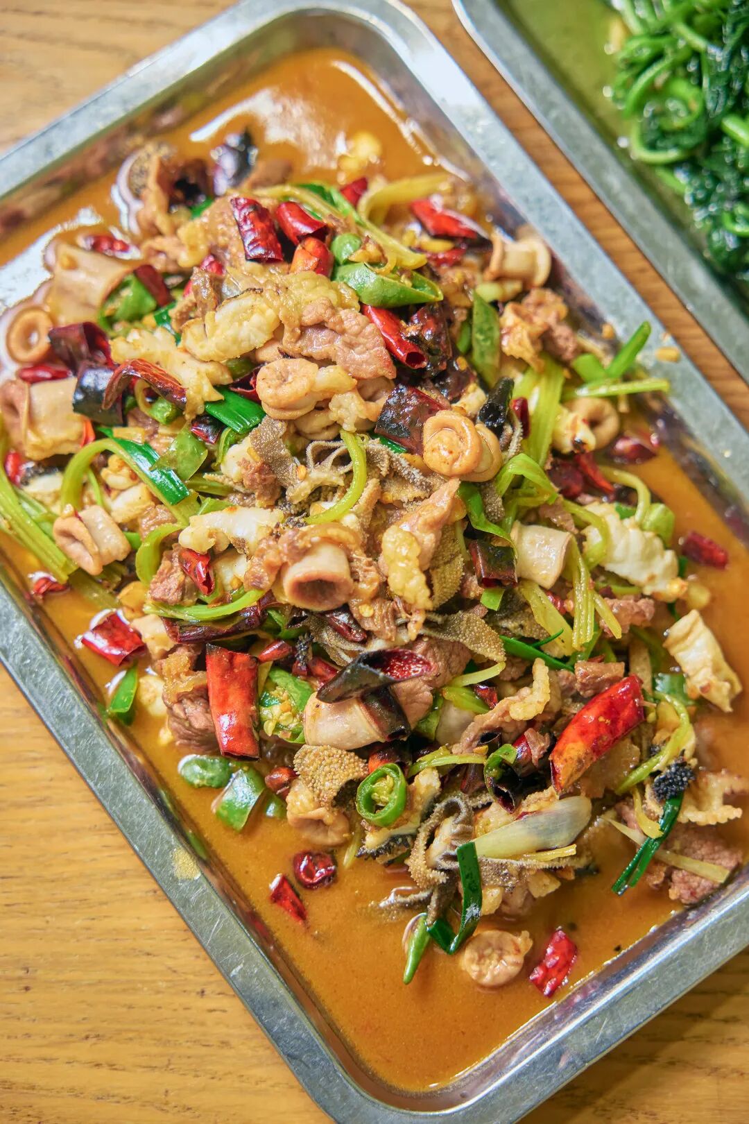 明厨明档跟餐厅连通,非常方便我站在灶台旁边观望。灶台边的配菜区里不外乎干辣椒、鲜辣椒、刨成条的芹菜和蒜苗,调料也就是蒜米、姜片、腌辣椒和几种提前调好的酱料。厨师大火颠锅,所有材料一齐下锅翻炒,其间加入各种配菜和调料,倒像是没什么特别之处的样子,唯有那一身奋力使用锅铲的力气,仿佛用得越多,就有越足的锅气萦绕在牛料之上。