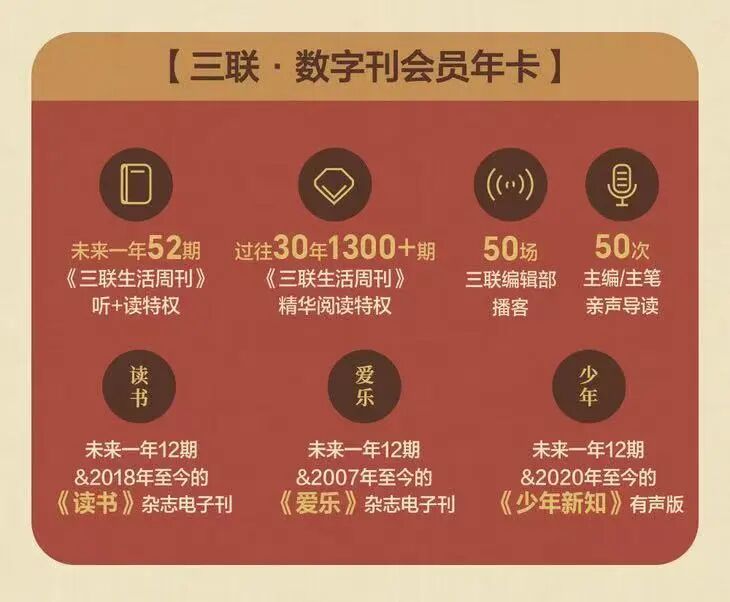 数字刊会员,拿来享用《三联生活周刊》《爱乐》《读书》《少年新知·有声版》,定期更新,随时回溯,全家人都能找到喜欢又合适的内容。