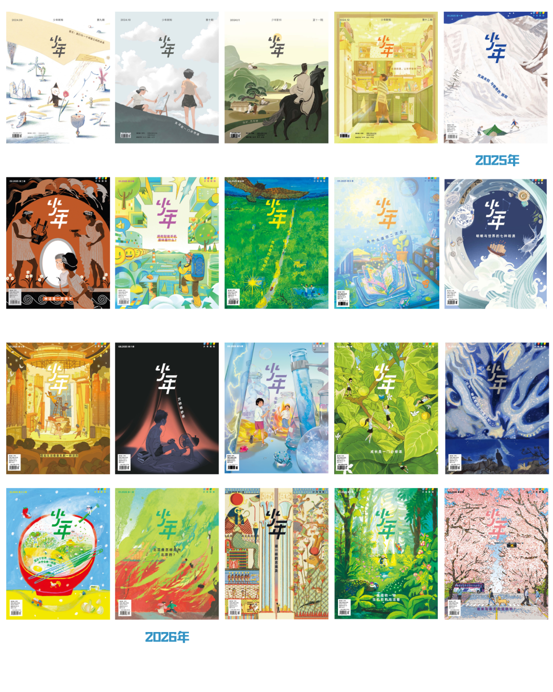 自2020年6月创刊,《少年新知》已经推出60期杂志。我们的主题涉及时间、魔法、友谊、家庭、偶像、未知、运动、冬日、海洋、倾听与表达、网络生存、像侦探一样思考、历史、成长的烦恼、微观世界、写作实验室、清单、博物馆、爱情、野外、情绪、音乐、美食、建筑、物理、秋日、漫画、流行、故事、社团、身体、AI、南北朝、游戏、古生物、语文、苏东坡、厨房、旅行、神话、智能手机、野生动物、二次元、明朝、音乐剧、夜晚、化学、成长、庄子、面条、北京、古埃及、植物、诗歌等。