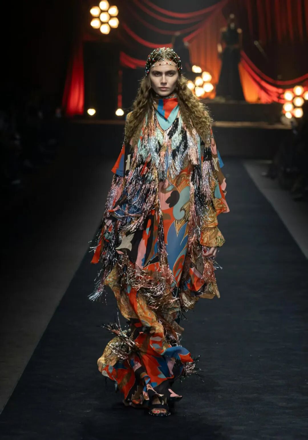 Etro 向来是极繁主义的典范,在2026春夏系列中以一种近乎反叛的姿态拥抱极繁美学——运用了流苏、金属铆钉、褶边、玻璃珠饰加上大量品牌标志性印花与金属提花织物,铺排出令人目不暇接的华丽景象。色彩也毫不收敛,紫红、绿松石、柑橘黄与地中海深蓝交错登场,浓烈炽热。