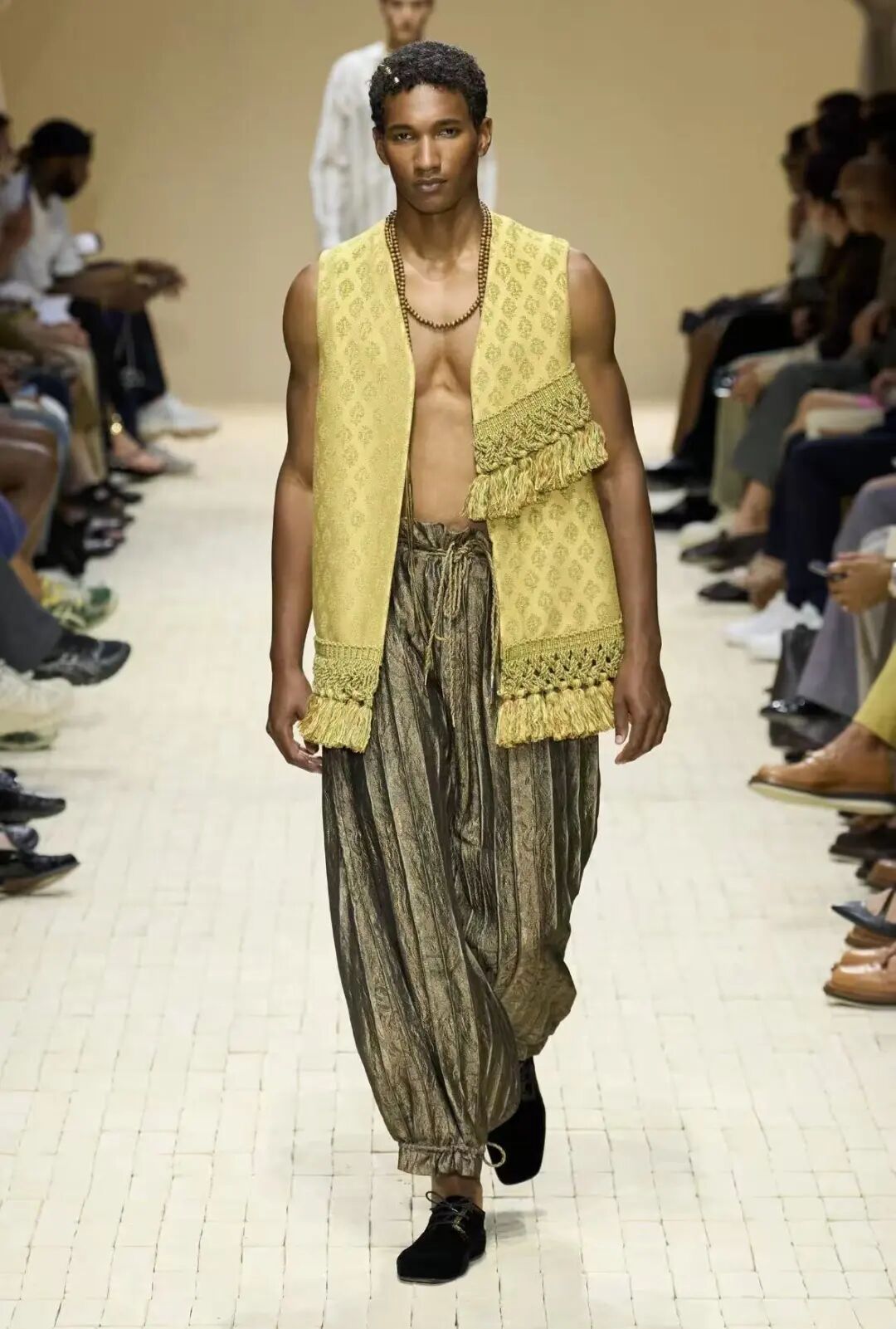 更有意思的是男装上的流苏。流苏历来与女性气质挂钩。2026年,Emporio Armani把流苏当装饰运用在男装上;Louis Vuitton男装系列在Pharrell Williams的操刀下,以印度文化为灵感,在剪裁和面料中融入了流苏的飘逸质感。当流苏出现在男装上,它不再是“柔美”的象征,而转化为一种不受拘束的、诗意的力量。这不是在推广“男性穿流苏”的穿搭公式,而是一次符号实验:为什么装饰性元素只能是“女性化”的?为什么男性的着装必须停留在实用、硬朗、克制的框架里?