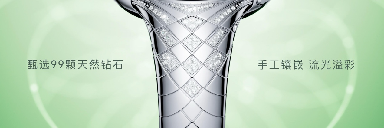 HUAWEI WATCH ULTIMATE DESIGN 非凡大师 星钻绽放手表以春天为设计灵感,撷春日韵律之美,以自然灵感勾勒非凡设计。表带以斐波那契黄金比例曲线为纹理,如具备生命力的藤蔓般延伸,并手工镶嵌98颗天然钻石,交相辉映,成就腕间艺术之作。表冠中央一颗天然钻石镶嵌其中,侧面精雕18个星钻切面,呈现玉兰花绽放的优雅姿态,每一次抬腕,皆是高端品味的无声表达。