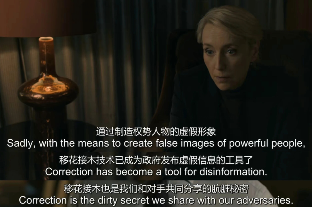 负责肖恩案件的,是高级督察瑞秋(也是全剧的女主)。跟随她的调查视角,我们渐渐了解到肖恩所卷入的巨大黑幕。原来,情报机构早在很多年前,暗中启动了一项名为“校正”(原文为correction,部分字幕组会翻译成‘移花接木’)的深度伪造技术。