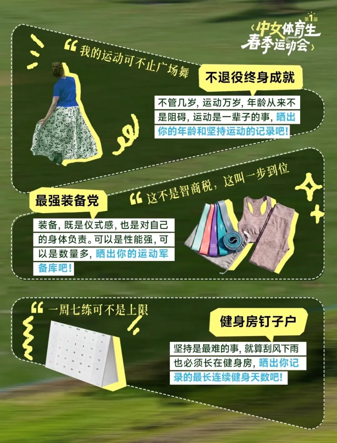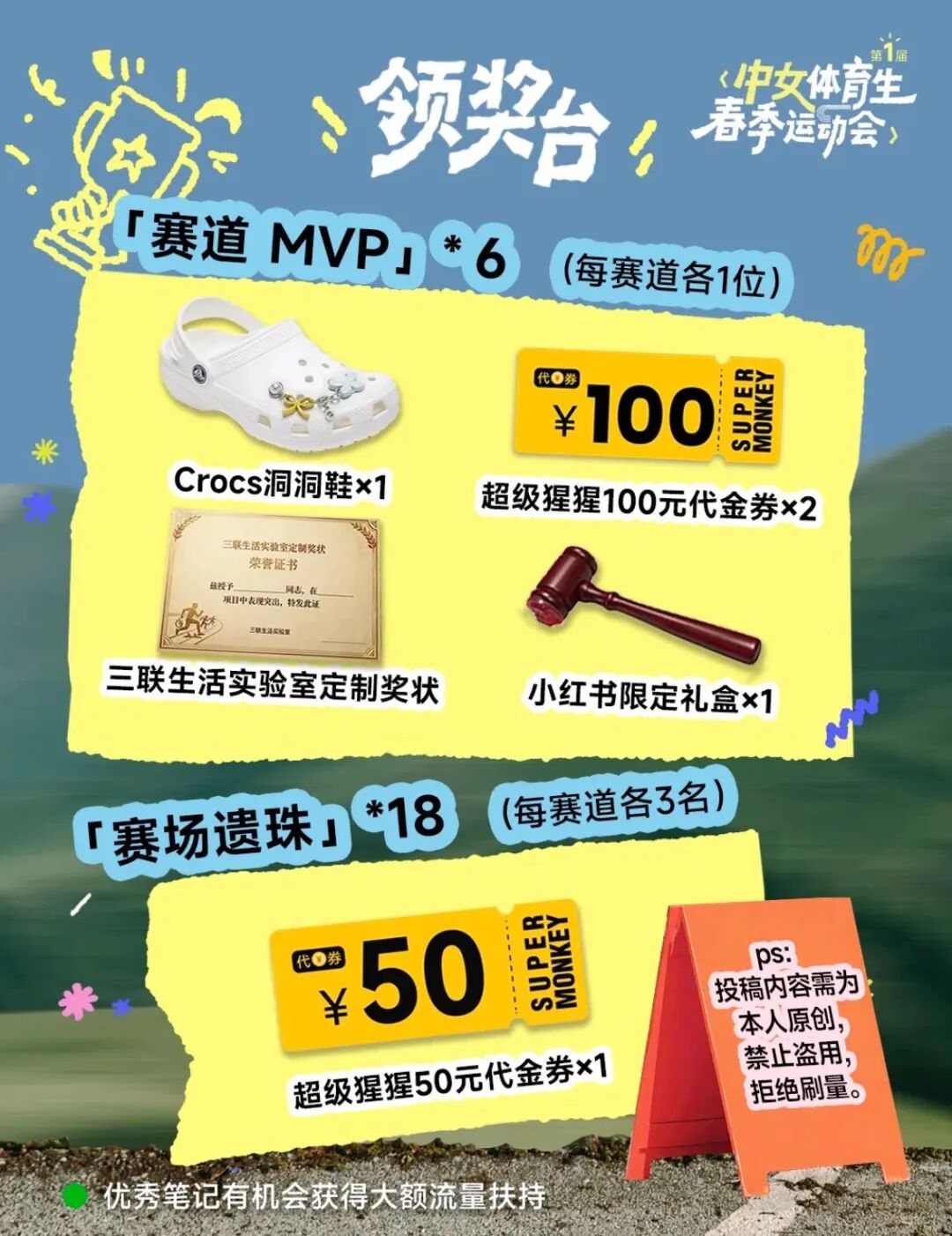 或是带“第一届中女体育生春季运动会”tag发笔记,秀出你的训练痕迹和健身记录,优秀笔记有机会获得大额流量扶持。